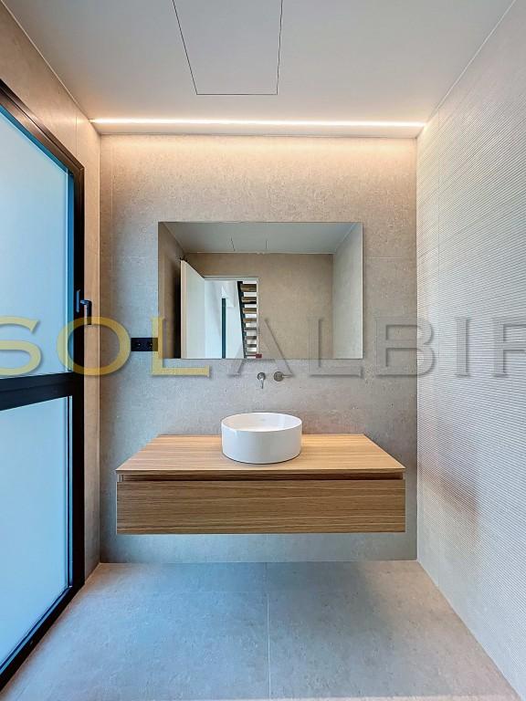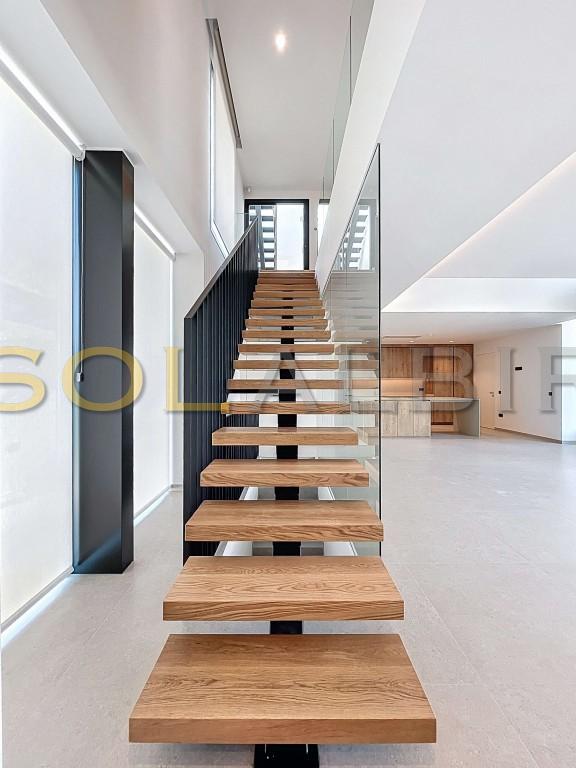 Una elegante escalera con escalones de madera conduce a la primera planta, donde encontrará tres dormitorios con baño en suite, cada uno con ducha a ras de suelo. Los baños se integran a la perfección con los dormitorios, y el dormitorio principal cuenta con un inodoro independiente y otra habitación con ducha y lavabo doble en el dormitorio principal. El dormitorio principal también tiene acceso a una amplia terraza privada, parcialmente cubierta y descubierta, con vistas a la piscina. Los armarios empotrados ofrecen amplio espacio de almacenamiento en todos los dormitorios.