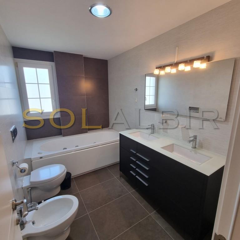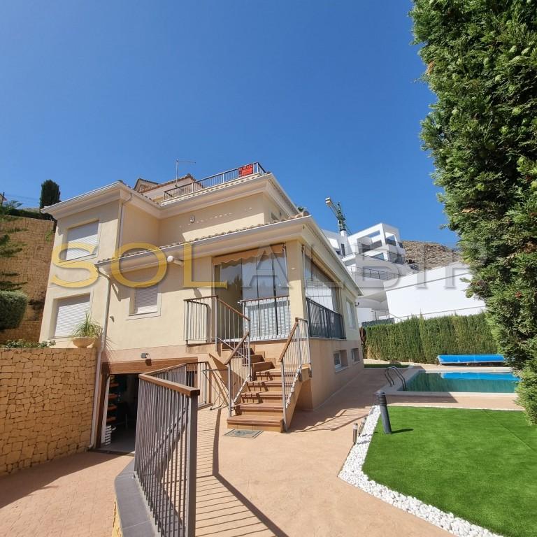 Villa mediterránea, autentica en venta en Golf Bahia Finestrat. Es una villa muy soleada de 346 m2, que fue construida en el año 2009 y se compone de 3 plantas, 4 habitaciones, 3 baños completos, una amplia cocina, un salón con chimenea, una terraza acristalada, un balcón, un solárium con esplendidas vistas al mar y a la montaña. Cuenta con armarios empotrados, suelo radiante y aire acondicionado. Tiene parcela de 574 m², piscina privada y un garaje amplio.La casa se encuentra en una zona residencial muy tranquila y con seguridad. Tiene fácil acceso a la autopista para ir a Alicante o a Valencia. A solo 3 km se encuentran las playas de Benidorm y todos los servicios necesarios. Para más información llame a nuestra oficina.