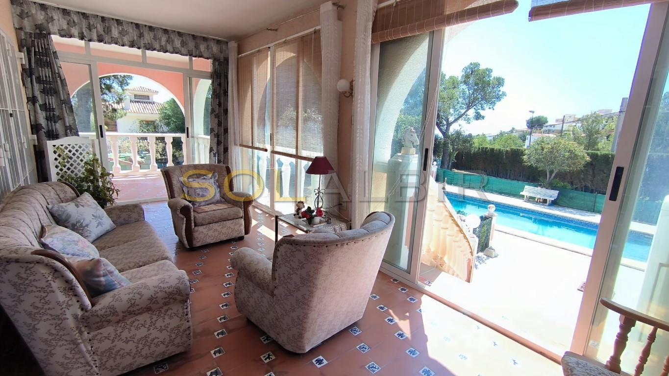La villa se distribuye en una sola planta con un amplio salón-comedor y chimenea que da acceso a una magnífica terraza acristalada y soleada . Esta se comunica con el jardín y la piscina privada.