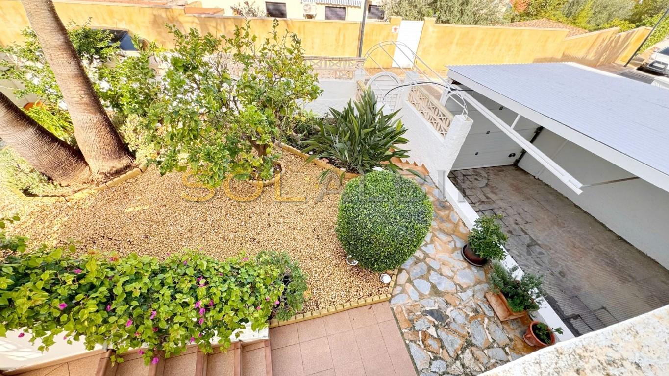 Al acercarnos a la villa, en la planta inferior encontramos una cochera, un garaje cerrado y un amplio trastero, todo ello enmarcado por un atractivo jardín delantero, pavimentado y con plantas con sistema de riego automático.