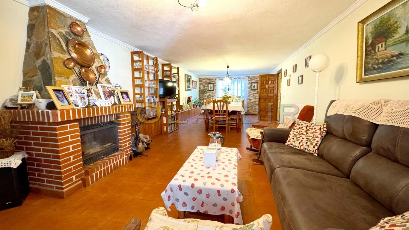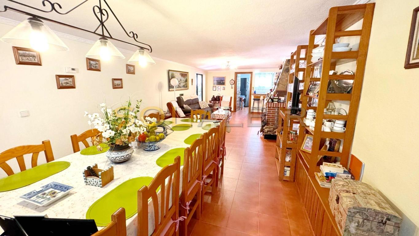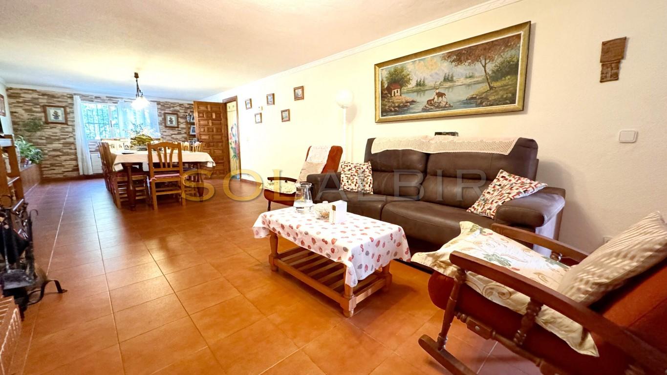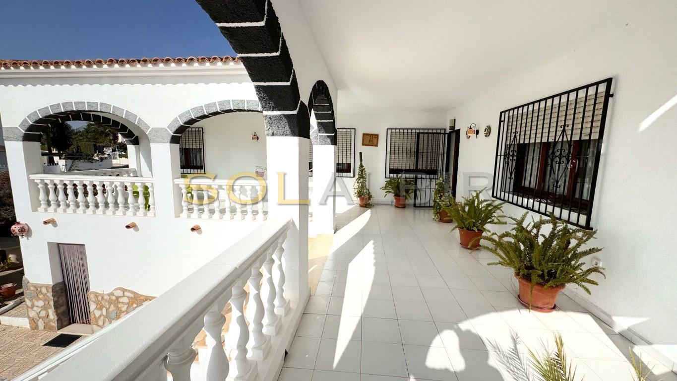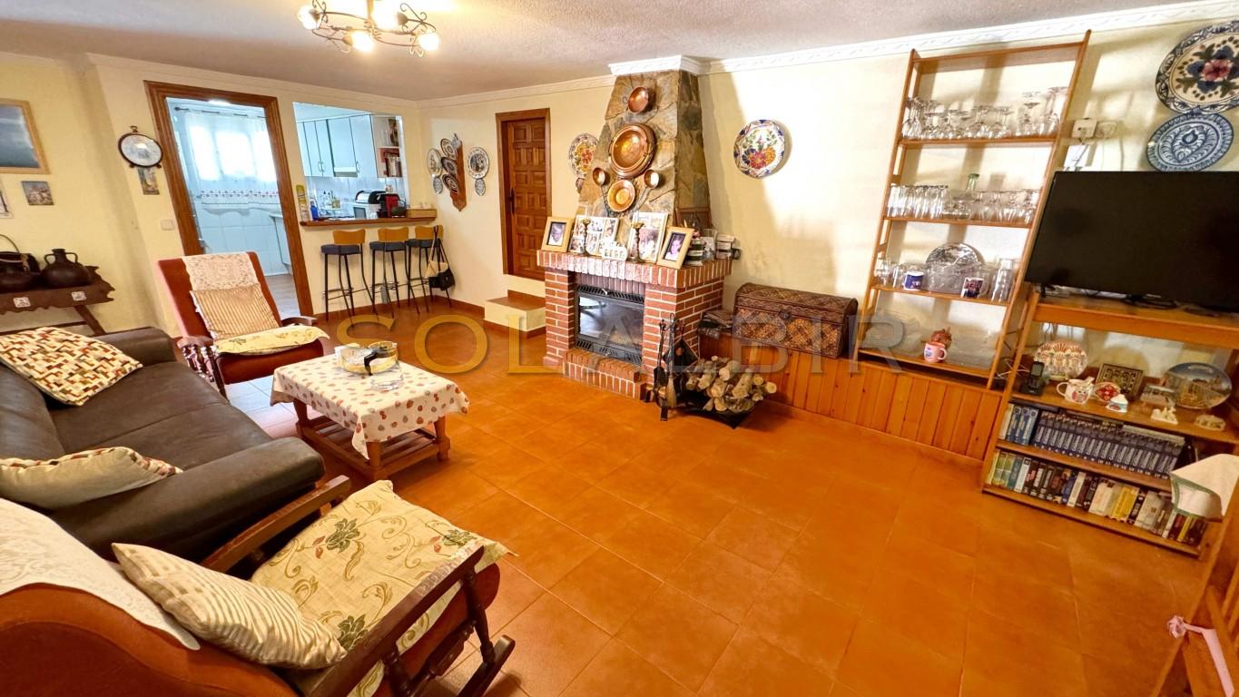 La casa principal, subiendo unas escaleras desde las que se disfruta de unas preciosas vistas panorámicas a las montañas y a la costa, está rodeada en la parte delantera por una gran terraza cubierta , desde la que hay otra pequeña terraza en la azotea a la que se accede por una escalera de caracol. Una vez en el chalet, se accede a un salón comedor muy espacioso con una acogedora chimenea. La cocina cerrada está equipada y también da a otra terraza en la parte trasera de la casa.