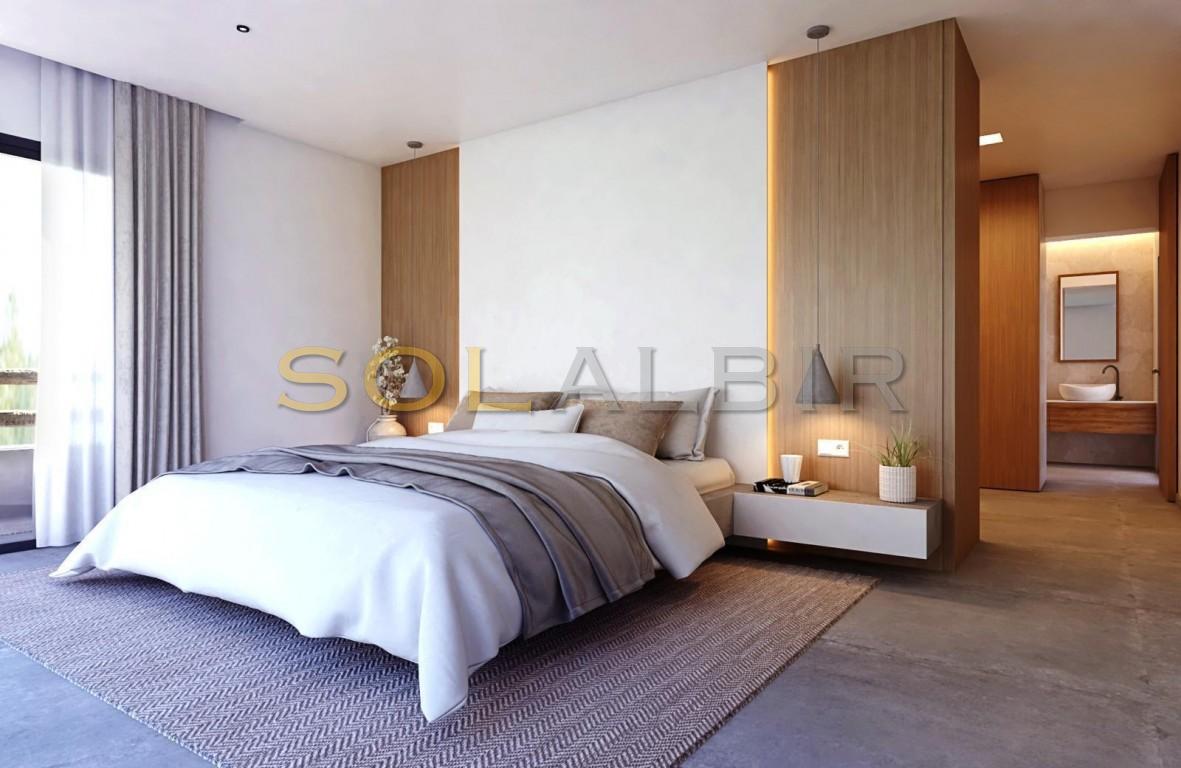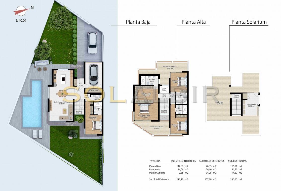 Esta hermosa villa de dos plantas y solárium en la azotea cuenta con cuatro amplios dormitorios, cada uno con baño en suite , lo que garantiza privacidad y comodidad para todos. La planta baja incluye un dormitorio , ideal para invitados o familiares que necesiten un acceso más fácil. Cada baño está equipado con modernos platos de ducha y un aseo adicional.