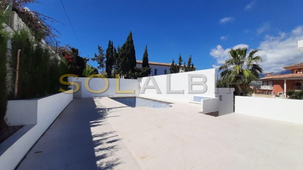 Chalet independiente completamente reformado de 2 plantas en una tranquila calle residencial del popular Albir. La planta baja ofrece un amplio salón con cocina americana, 2 dormitorios y 2 baños. En la planta superior, encontramos otro salón con cocina americana, que da a una gran terraza con vistas panorámicas. Un dormitorio con baño en suite y otro dormitorio con baño. El garaje da entrada directamente a la casa y ofrece aparcamiento adicional justo delante. La piscina privada con una enorme terraza se encuentra en la parte trasera de la propiedad, lo que garantiza total privacidad. ¡Ideal para una familia numerosa!