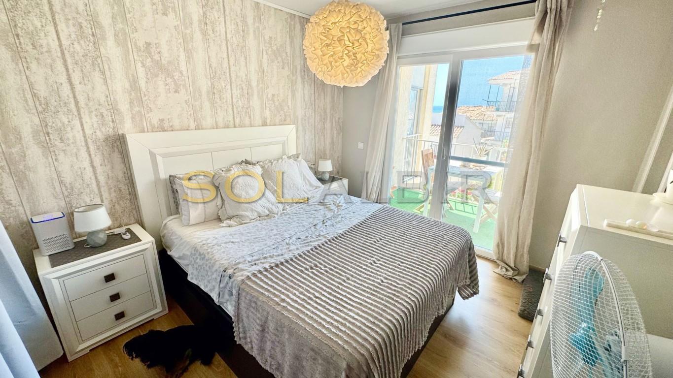 Disfrute de un ambiente amplio y luminoso gracias a su orientación este-oeste y sus amplios ventanales. El apartamento cuenta con tres amplios dormitorios con armarios empotrados y dos modernos baños con ducha a ras de suelo. El dormitorio principal incluye baño en suite y un pequeño balcón privado con vistas al pueblo y al mar.