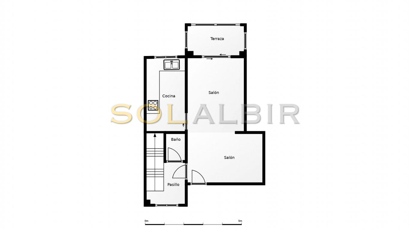 Planta baja: Amplio salón-comedor con amplios ventanales, luz natural y acceso directo a una amplia terraza, ideal para comer al aire libre o relajarse con vistas al jardín. En esta planta también se encuentra una cocina independiente totalmente equipada y un aseo de cortesía.