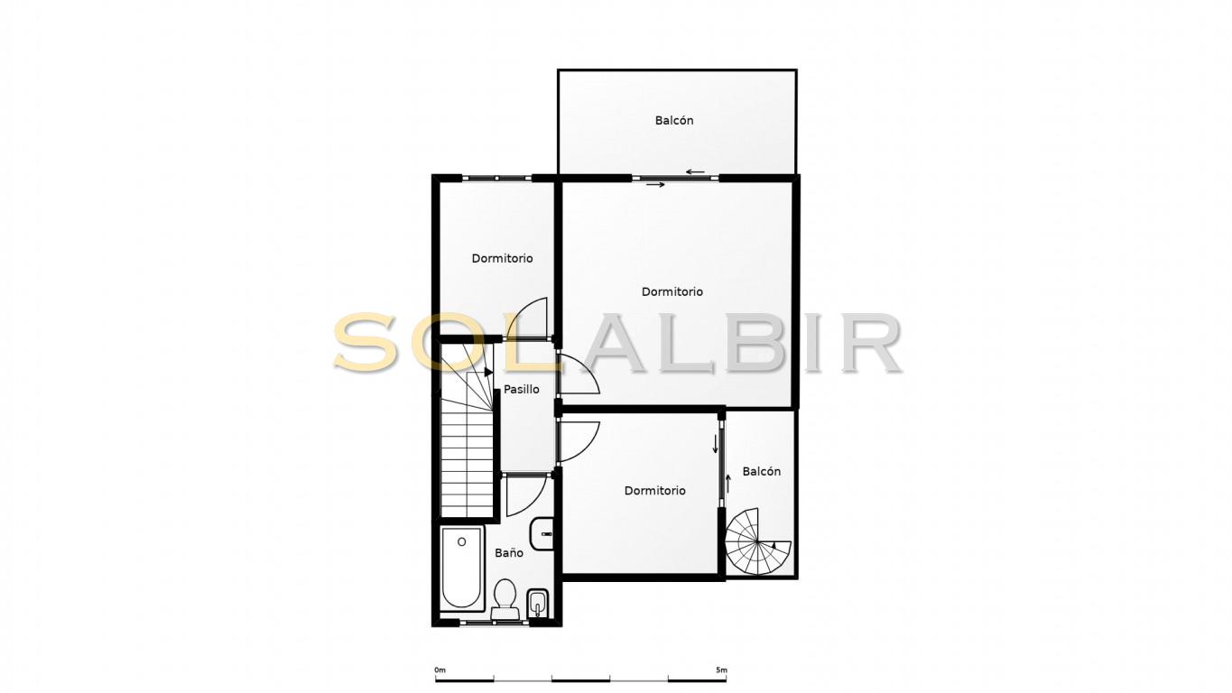 Primera planta: Tres dormitorios en total: uno individual pequeño y dos dobles amplios con acceso a su propia terraza privada, donde podrá disfrutar de maravillosas vistas. Desde una de estas terrazas, una escalera conduce al solárium privado, que ofrece vistas panorámicas de 360° a las montañas, el mar y el horizonte. Un lugar único para contemplar amaneceres y atardeceres inolvidables.