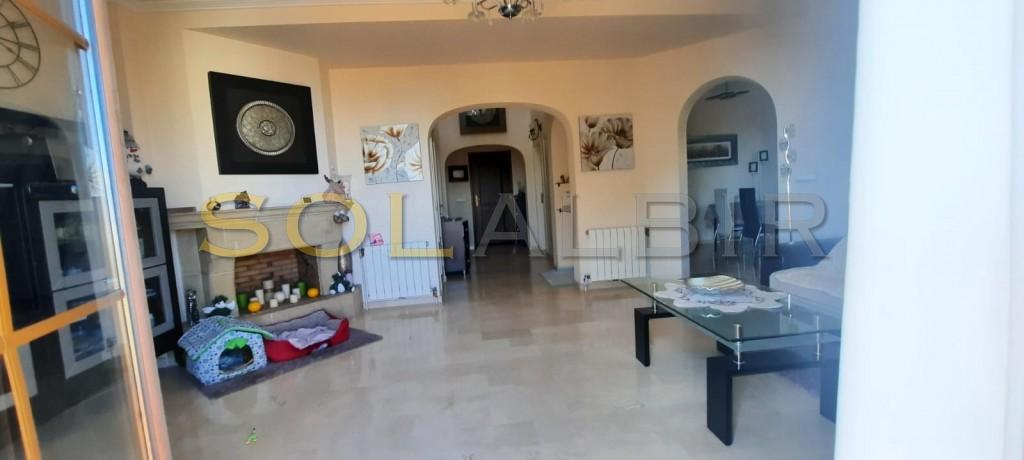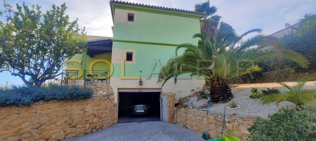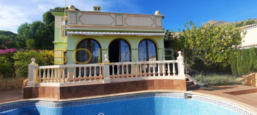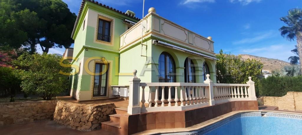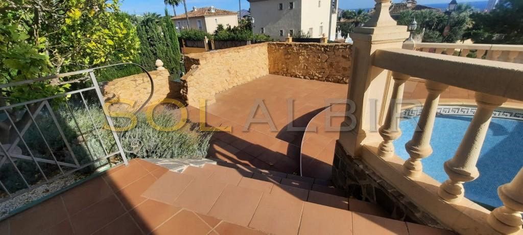 Villa de estilo mediterráneo con vistas al mar y a la montaña en venta en Golf Bahía, Finestrat. Se trata de una villa de tres plantas con piscina y jardín. Tiene una superficie de 313 m² y una parcela de 548 m². Fue construida en 1996 y se encuentra en muy buen estado, lista para entrar a vivir. Consta de tres plantas. En la planta principal se encuentra un amplio salón con chimenea y acceso a la piscina y al jardín, un comedor, una gran cocina totalmente equipada y un aseo de invitados. En la primera planta se encuentran los dos dormitorios, ambos con baño en suite, vestidores, armarios empotrados y acceso a una gran terraza con espléndidas vistas al mar y a la montaña. En el sótano se encuentran el garaje, una habitación, un gimnasio y una bodega, además de un taller y un trastero. Podría convertirse en un apartamento de invitados. El jardín cuenta con árboles frutales y hermosas plantas. Delante de la villa hay una terraza cubierta, un largo pasillo y la piscina. Dispone de agua caliente y calefacción con electricidad y gas. La terraza de la primera planta cuenta con toldo y es muy amplia y soleada. Es una villa muy luminosa gracias a su orientación sur. Se encuentra en una zona privilegiada, con seguridad y cerca de todos los servicios necesarios. Tiene fácil acceso a la autovía para ir a Valencia o Alicante. Para más información o concertar una visita, llame a nuestra oficina.