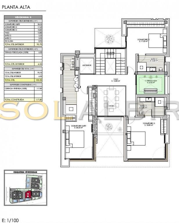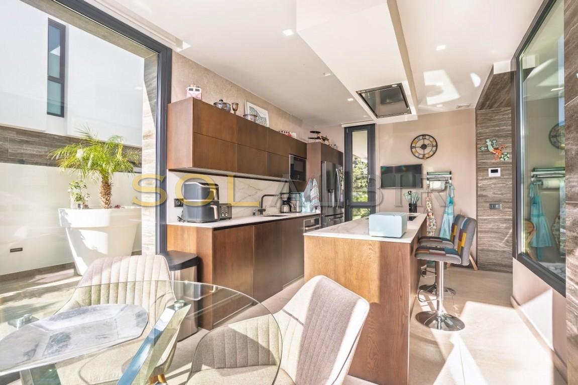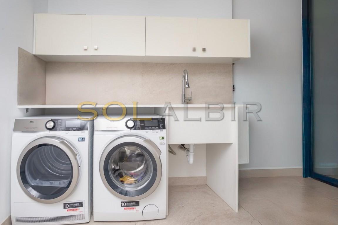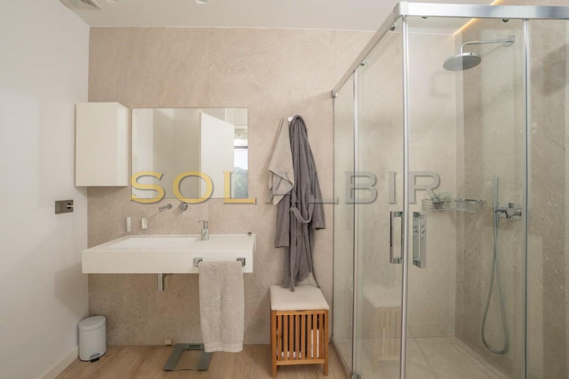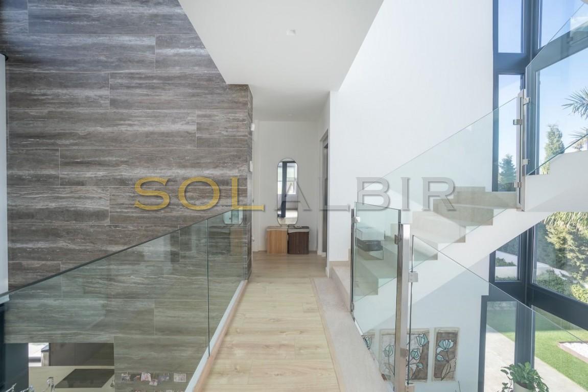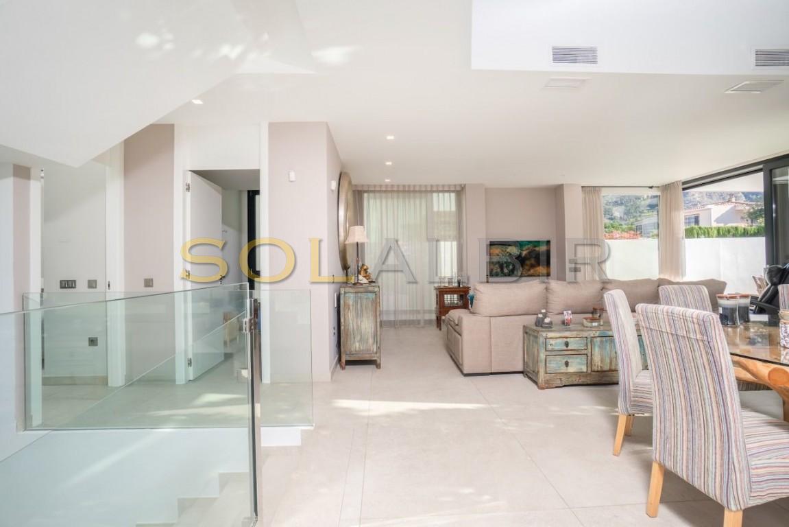 Moderna villa en el corazón de El Albir. Ubicada en la zona llana del pueblo, esta excepcional ubicación le permite llegar caminando a las mejores zonas comerciales y gastronómicas del Albir en tan solo unos minutos. La villa cuenta con un jardín de fácil mantenimiento con piscina de agua salada y una encantadora terraza. También dispone de aparcamiento exterior con puerta motorizada. La villa consta de planta principal, planta alta con dormitorios, solárium y un exclusivo sótano de diseño con una amplia sala multiusos con zona de billar, bar, cine, despensa y un baño completo con ducha. Este sótano incluye un luminoso patio interior con abundante luz natural. También alberga el lavadero, el trastero y un espacioso garaje. Todas las plantas están conectadas por una hermosa escalera interior y un ascensor. En la planta principal se encuentra un amplio y luminoso salón con cocina americana, un dormitorio y un baño. La planta alta alberga el dormitorio principal y dos dormitorios adicionales. Todos los dormitorios tienen baño en suite y grandes ventanales. El solárium ofrece vistas excepcionales y cuenta con paneles fotovoltaicos para reducir el consumo energético y las emisiones. La propiedad prioriza la privacidad y está equipada con toldos, mientras que los dormitorios cuentan con persianas y cortinas opacas. También cuenta con un completo sistema de aire acondicionado, suelo radiante, aerotermia, domótica, sistema de alarma, cámaras de seguridad, aspiración centralizada y descalcificación de agua.