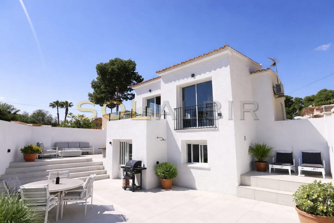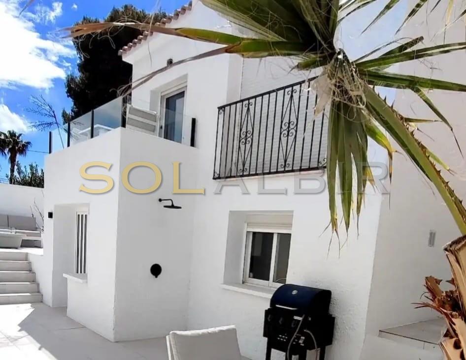 HERMOSAS VISTAS DESDE UNA PROPIEDAD MODERNIZADA CON 2 APARTAMENTOS. La propiedad se encuentra en una parcela de 334 m² y consta de dos plantas. En la planta superior, se encuentra la entrada a la zona de estar principal, donde se ha instalado aire acondicionado frío/calor en el salón, hay 2 dormitorios dobles, un área con armarios y un baño completo con ducha y radiador. Hay un amplio salón-comedor con cocina abierta integrada de diseño moderno y hermosas vistas desde el interior y la terraza exterior. Existe la posibilidad de transformar un trastero en un dormitorio adicional para mayor comodidad. Desde su terraza privada, podrá disfrutar de las impresionantes vistas y de maravillosas puestas de sol diarias. En la planta inferior, hay un encantador apartamento completamente funcional; también tiene el mismo concepto abierto entre el salón-comedor y la cocina abierta, y cuenta con un dormitorio confortable junto con su propio baño privado con ducha. El área exterior está embaldosada y es de fácil mantenimiento, y podrá disfrutar de un jacuzzi privado, además de una cocina exterior. La parcela cuenta con un aparcamiento cubierto y, además, una amplia zona descubierta para aparcar. Su orientación sureste garantiza luminosidad y luz solar constantes durante todo el año, aportando calidez natural a ambos espacios. La propiedad se encuentra a poca distancia en coche de Altea, Alfaz y La Nucia.