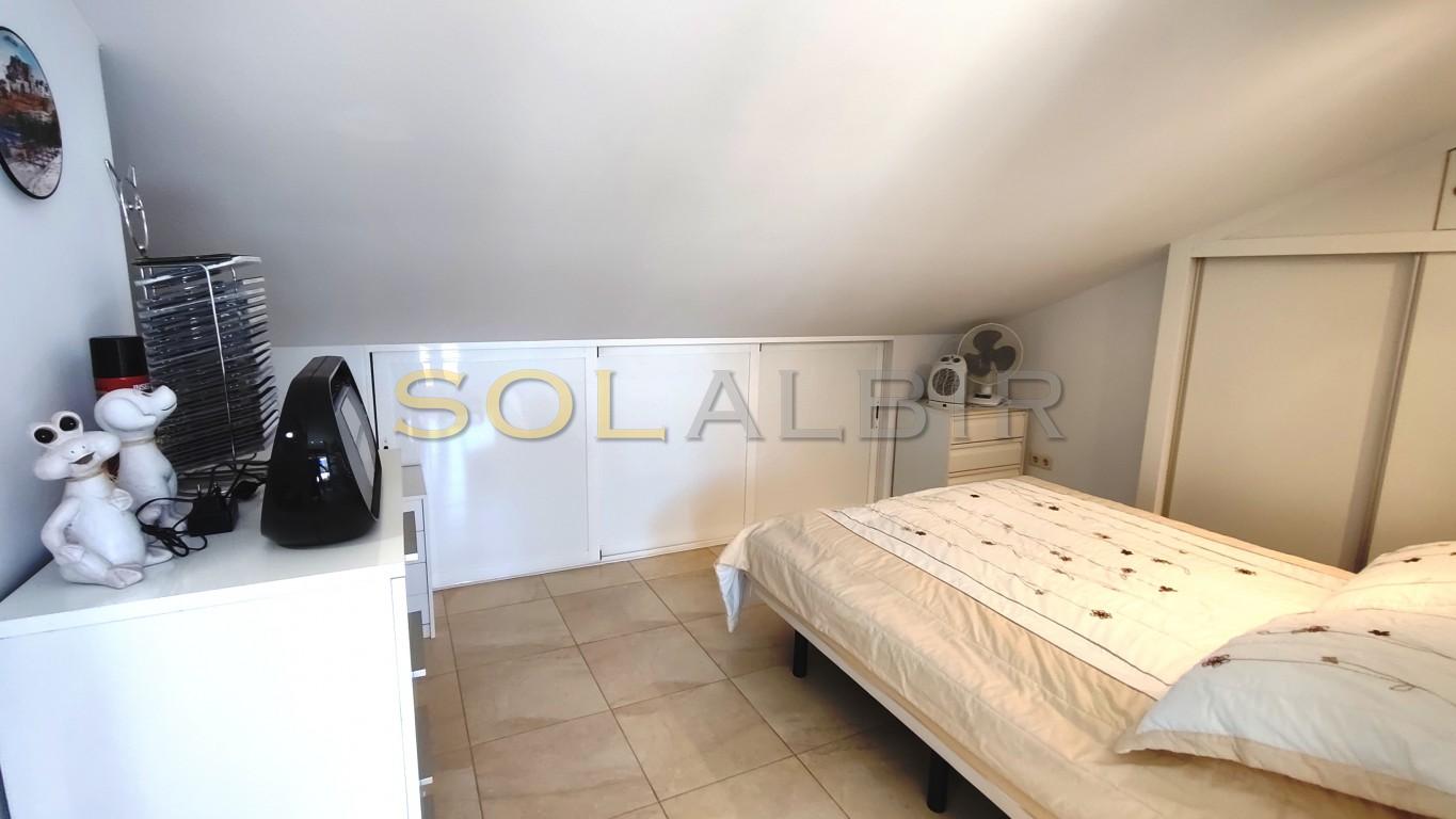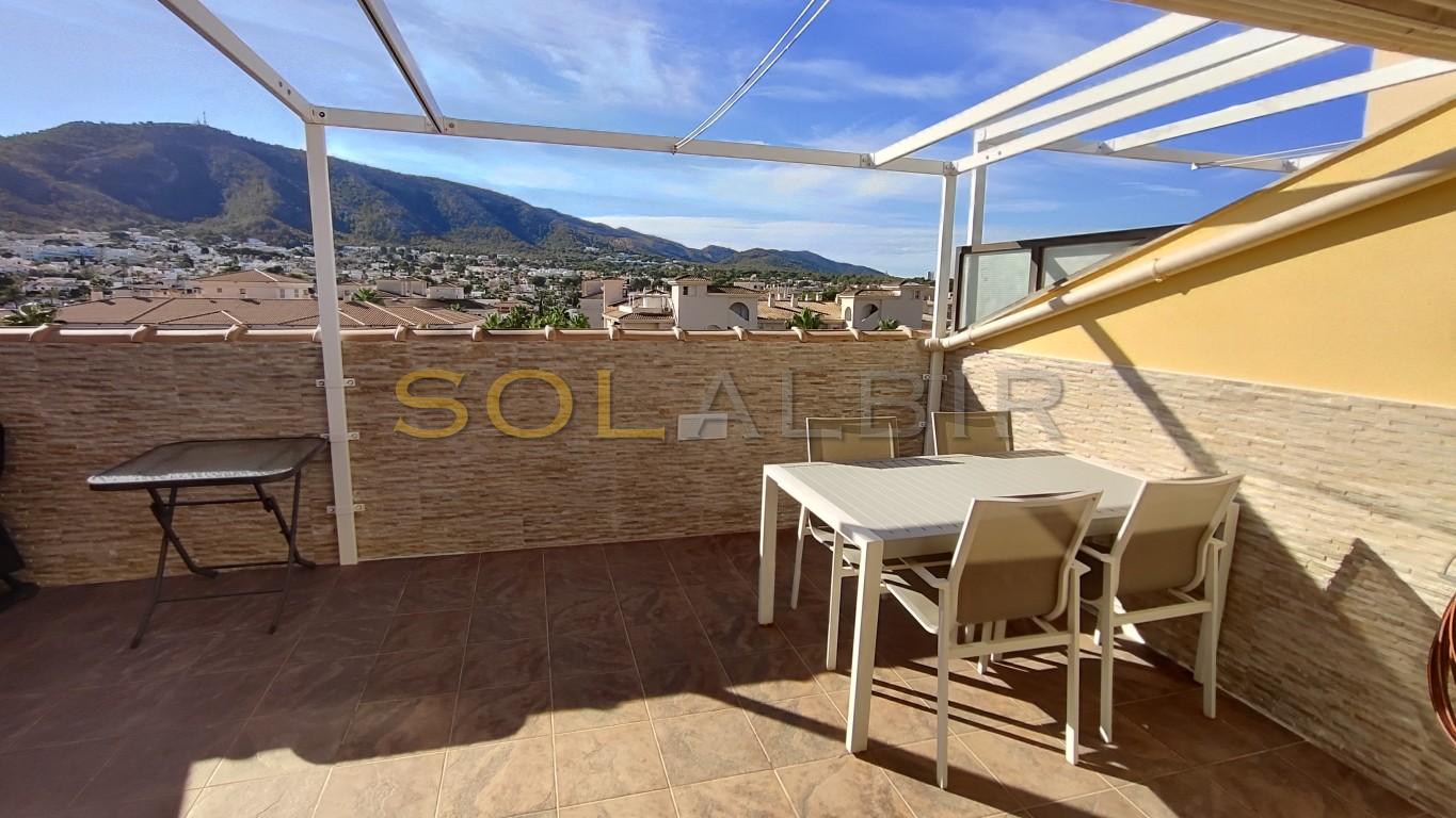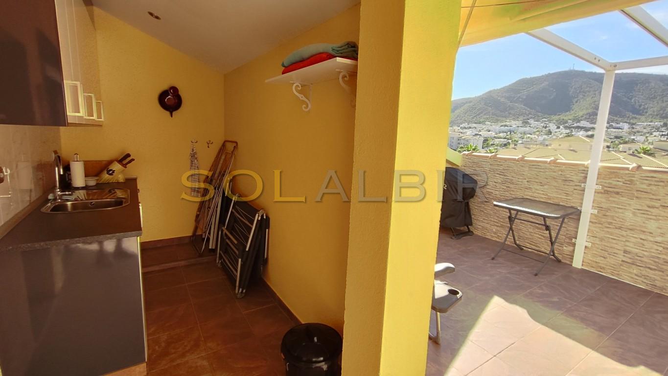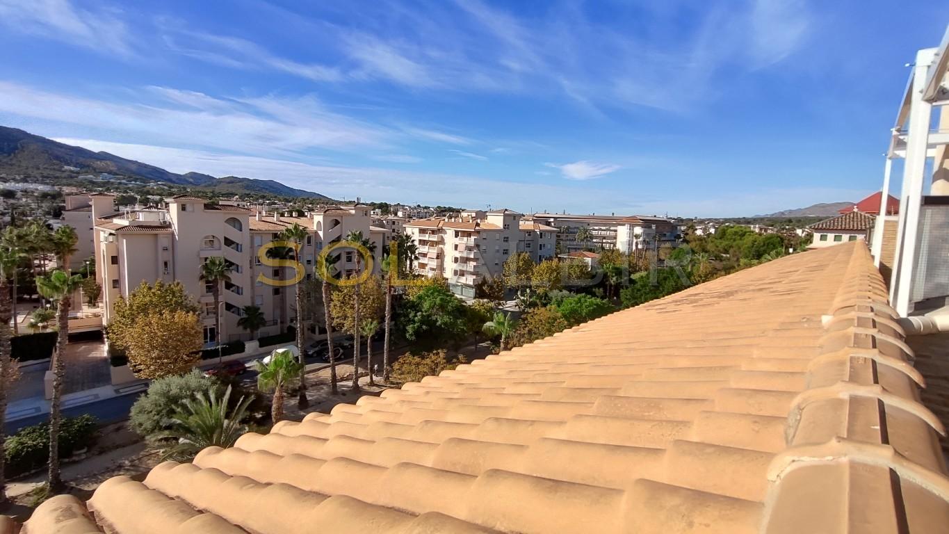 ZONNIG HOEKAPPARTEMENT OP DE BOVENSTE VERDIEPING OP HET ZUIDEN, MET OPEN UITZICHT IN AANTREKKELIJKE URBANISATIE. Het appartement is de laatste jaren gemoderniseerd en heeft een zeer goede standaard. Het is een duplex appartement met ca. 89 m2 in de woonkamer incl. een balkon en een gedeeltelijk overdekt dakterras, dus in totaal ca. 130 m2 in het appartement incl. terrassen. Op de begane grond is er een zeer lichte woonkamer verbonden met het balkon, dat is beglaasd met open uitzicht op de bergen en de stad. Er is een gemoderniseerde keuken met een galerij ernaast met wasmachine, 2 slaapkamers, waarvan de hoofdslaapkamer toegang heeft tot het balkon en een ensuite badkamer heeft, die is gemoderniseerd, en er is nog een badkamer van goede standaard, beide met douches. Boven is er een mooi ingericht dakterras op het zuiden, er is een zomerkeuken en er is een gastenverblijf met een slaapkamer en een toilet. In de prijs is een parkeerplaats en een afgesloten berging inbegrepen. Er is een prachtige gemeenschappelijke tuin met zwembad, tennisbaan en een speeltuin. Op loopafstand van het strand, winkels, restaurants en openbaar vervoer.