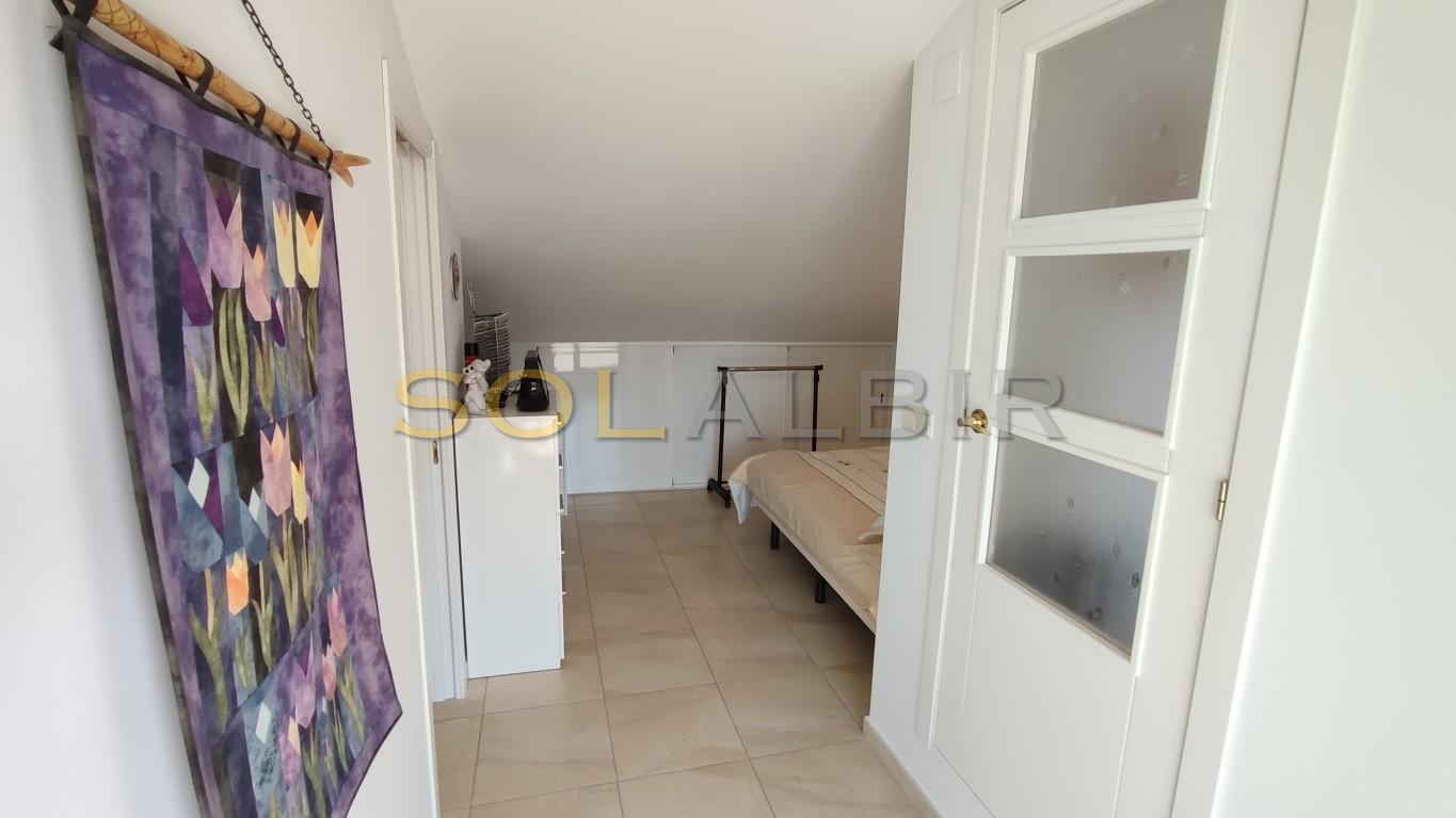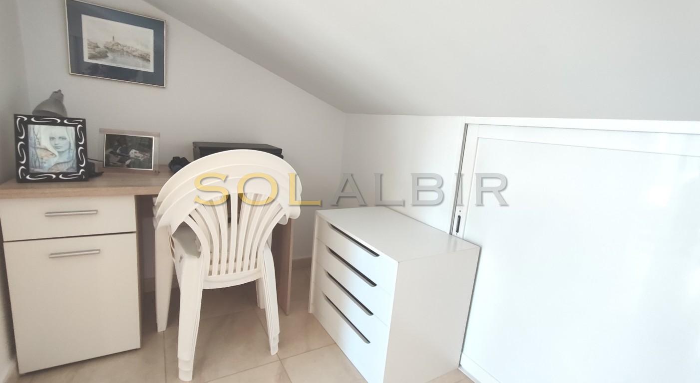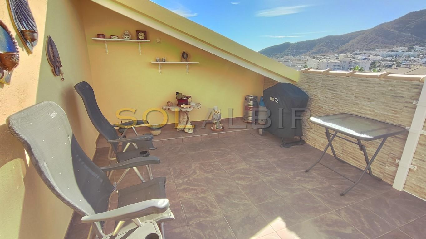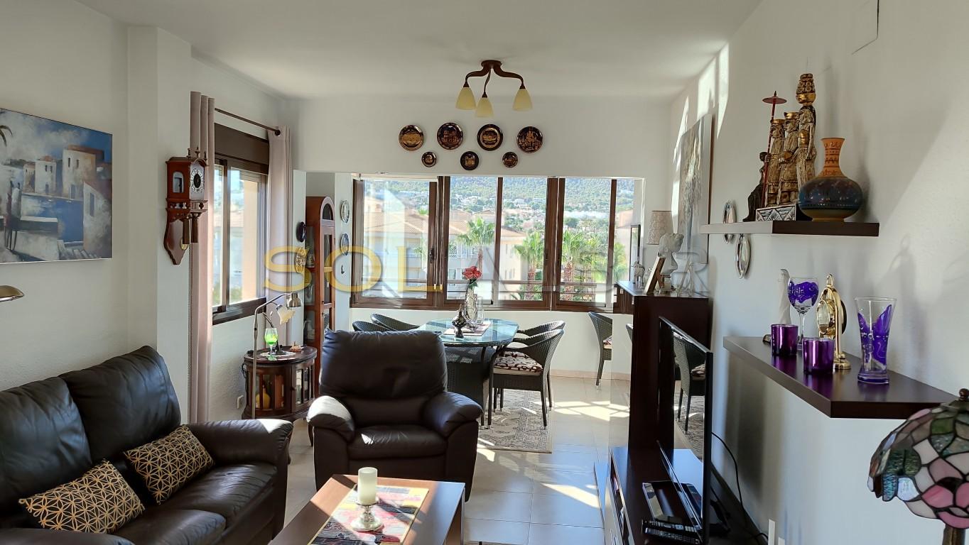ZONNIG HOEKAPPARTEMENT OP DE BOVENSTE VERDIEPING OP HET ZUIDEN, MET OPEN UITZICHT IN AANTREKKELIJKE URBANISATIE. Het appartement is de laatste jaren gemoderniseerd en heeft een zeer goede standaard. Het is een duplex appartement met ca. 89 m2 in de woonkamer incl. een balkon en een gedeeltelijk overdekt dakterras, dus in totaal ca. 130 m2 in het appartement incl. terrassen. Op de begane grond is er een zeer lichte woonkamer verbonden met het balkon, dat is beglaasd met open uitzicht op de bergen en de stad. Er is een gemoderniseerde keuken met een galerij ernaast met wasmachine, 2 slaapkamers, waarvan de hoofdslaapkamer toegang heeft tot het balkon en een ensuite badkamer heeft, die is gemoderniseerd, en er is nog een badkamer van goede standaard, beide met douches. Boven is er een mooi ingericht dakterras op het zuiden, er is een zomerkeuken en er is een gastenverblijf met een slaapkamer en een toilet. In de prijs is een parkeerplaats en een afgesloten berging inbegrepen. Er is een prachtige gemeenschappelijke tuin met zwembad, tennisbaan en een speeltuin. Op loopafstand van het strand, winkels, restaurants en openbaar vervoer.