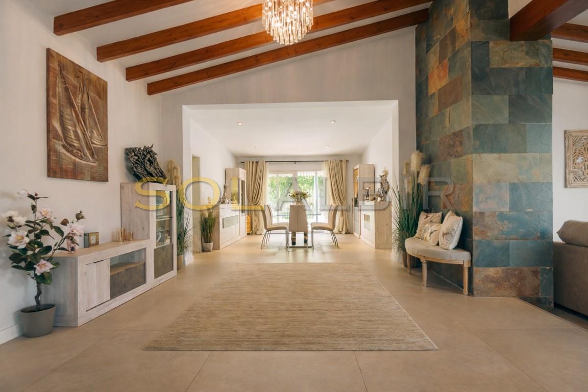 Deze elegante villa onderscheidt zich door haar mediterrane karakter en ontwerp. De zeer ruime en indrukwekkende woonkamer vormt het hart van het huis, met hoge plafonds en houten balken die warmte en persoonlijkheid aan de hele woning toevoegen.