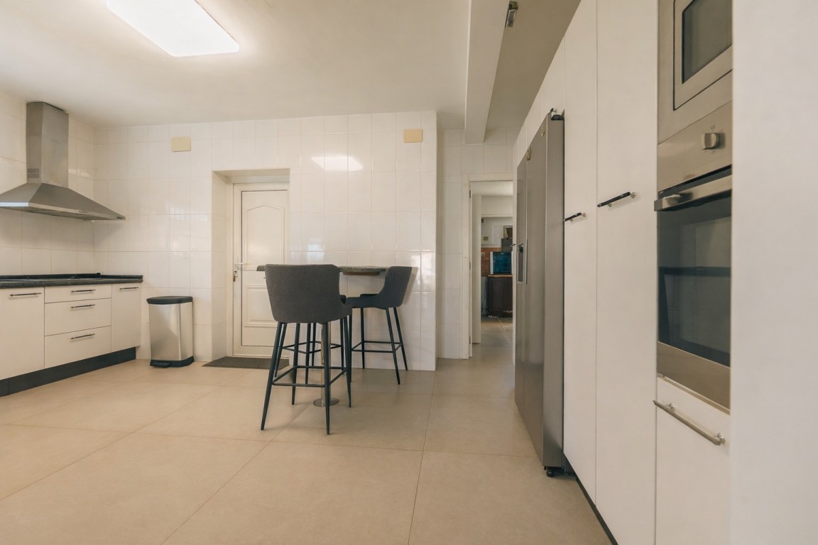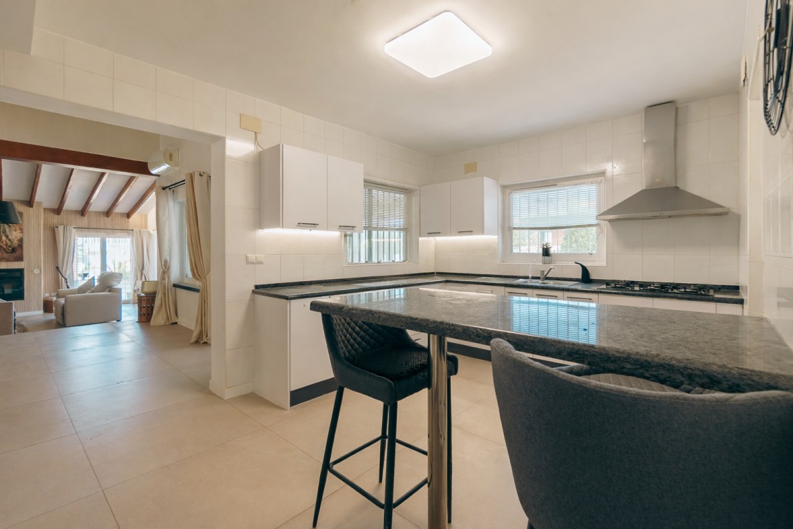 De keuken is vrijstaand, ruim en functioneel, uitgerust met moderne, lichtgekleurde kasten, granieten werkbladen en een ontbijtbar met barkrukken. De indeling biedt uitstekende opbergruimte en dagelijks comfort, met directe toegang tot de rest van het huis.