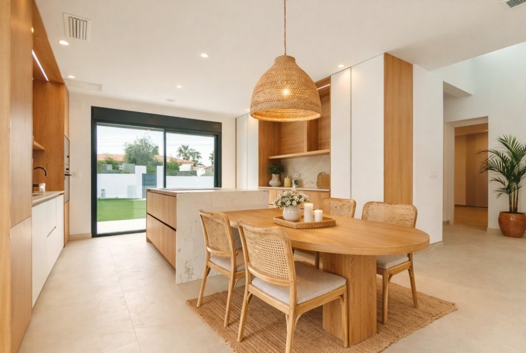 Første etasje har en åpen stue og spisestue, koblet til et moderne kjøkken. Dette rommet er perfekt for underholdning og hverdagsliv, og fører til et privat basseng med integrert trapp, og en stor terrasse og hageområde, ideelt for å nyte solfylte spanske dager.