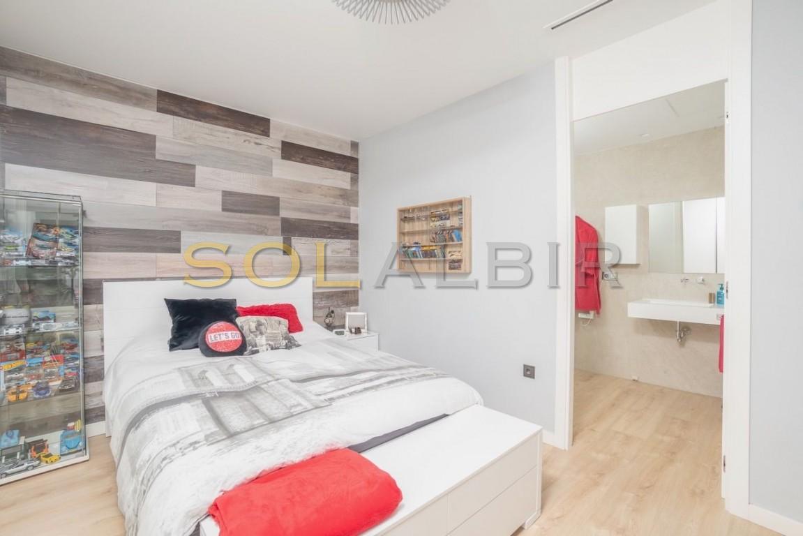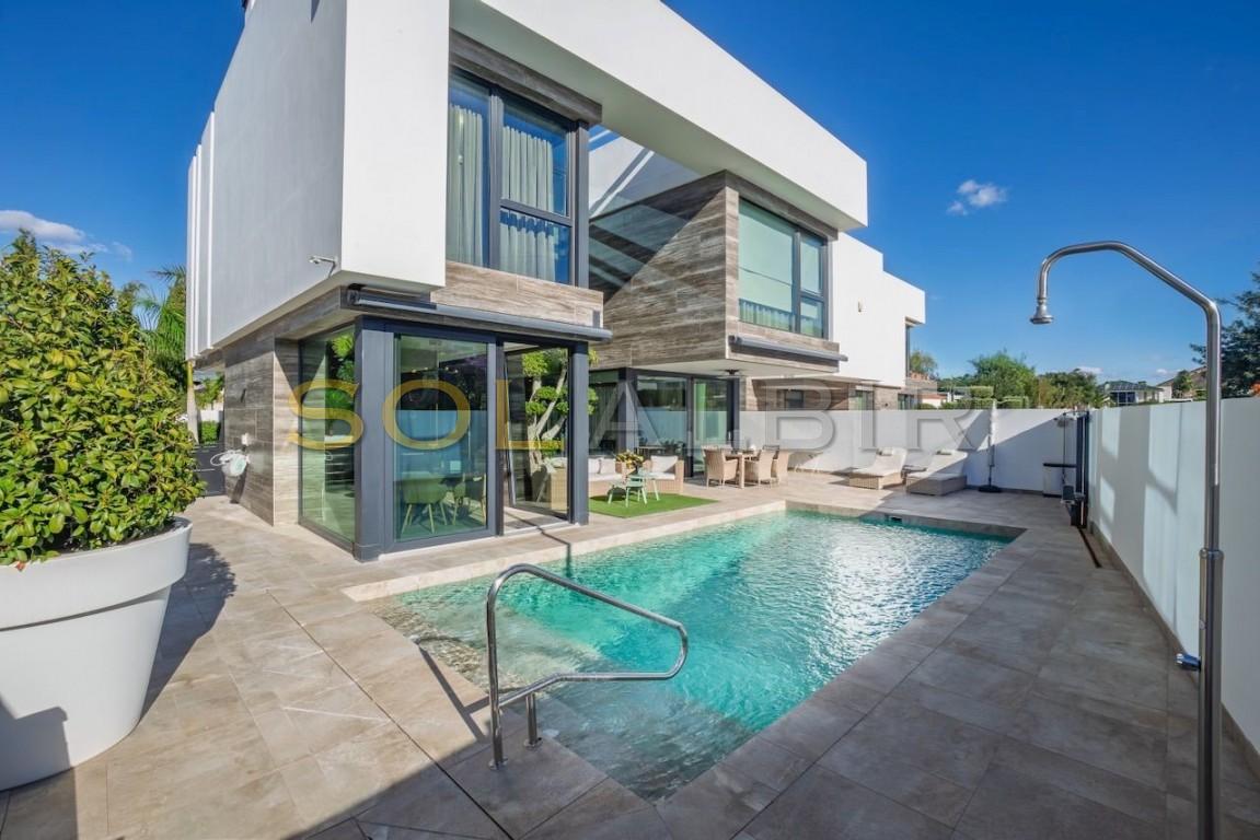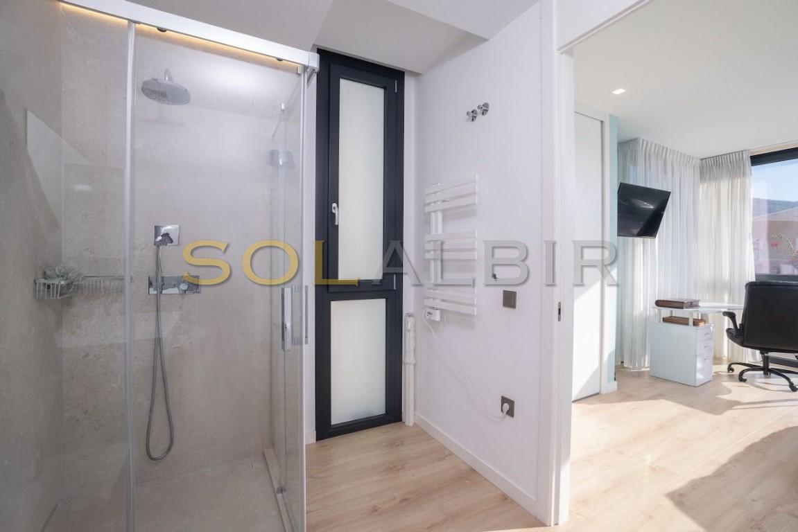 Moderne villa i hjertet av El Albir. Denne eksepsjonelle beliggenheten ligger i den flate delen av byen, og gir deg muligheten til å gå til alle Albirs beste shopping- og spisesteder på bare noen få minutter. Villaen kan skilte med en lettstelt hage med saltvannsbasseng og en herlig terrasse. Det er også en utendørs parkeringsplass med motorisert port. Villaen består av en hovedetasje, en øvre etasje med soverom, et solarium og en eksklusiv designerkjeller med et stort flerbruksrom med biljardområde, bar, kino, spiskammer og et komplett bad med dusj. Denne kjelleretasjen inkluderer en lys indre terrasse som gir rikelig med naturlig lys. Den huser også vaskerom, bod og en romslig garasje. Alle etasjer er forbundet med en vakker innvendig trapp og en heis. I hovedetasjen er det en stor, lys stue med åpen kjøkkenløsning, et soverom og et bad. Øvre etasje inneholder hovedsoverommet og to ekstra soverom. Alle soverommene har eget bad og store vinduer. Solariumet tilbyr eksepsjonell utsikt og har også solcellepaneler for å redusere energiforbruk og utslipp. Eiendommen prioriterer privatliv og er utstyrt med markiser, mens soverommene har blendingsgardiner og persienner. Den kan også skilte med et komplett klimaanlegg, gulvvarme, aerotermisk oppvarming, hjemmeautomasjon, alarmsystem, sikkerhetskameraer, sentralstøvsugersystem og vannavherdingssystem.