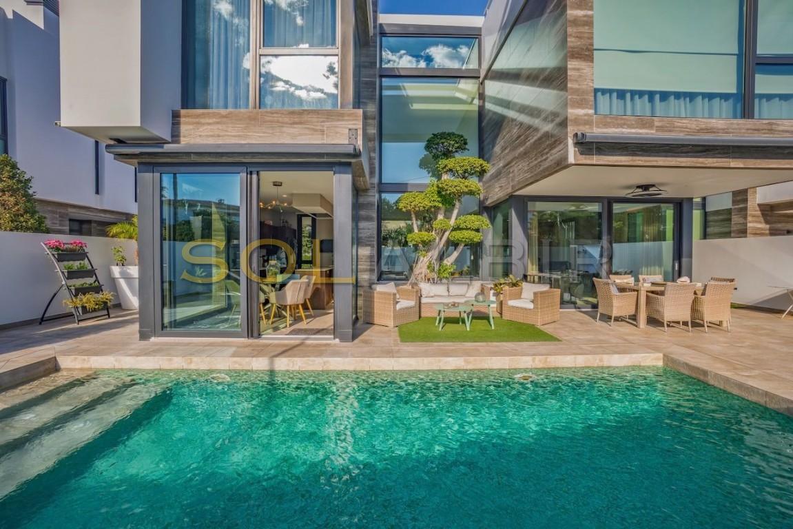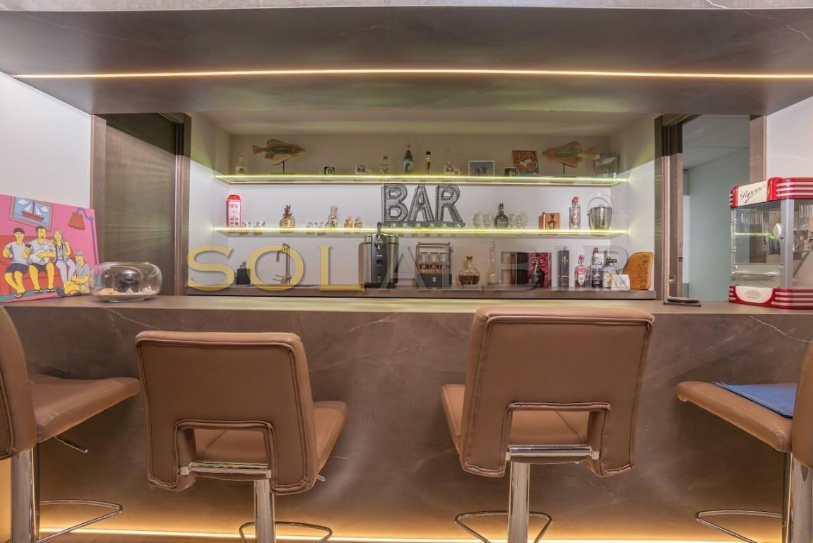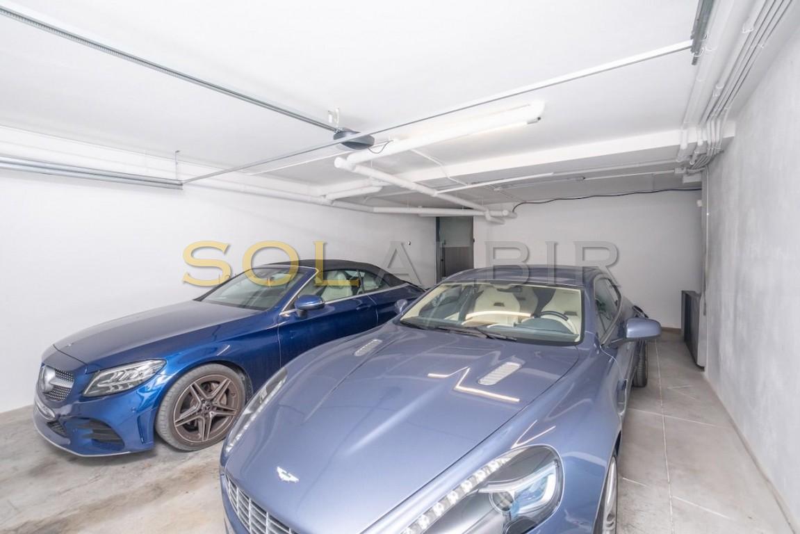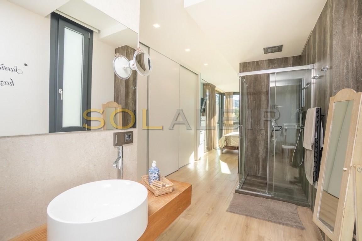 Moderne villa i hjertet av El Albir. Denne eksepsjonelle beliggenheten ligger i den flate delen av byen, og gir deg muligheten til å gå til alle Albirs beste shopping- og spisesteder på bare noen få minutter. Villaen kan skilte med en lettstelt hage med saltvannsbasseng og en herlig terrasse. Det er også en utendørs parkeringsplass med motorisert port. Villaen består av en hovedetasje, en øvre etasje med soverom, et solarium og en eksklusiv designerkjeller med et stort flerbruksrom med biljardområde, bar, kino, spiskammer og et komplett bad med dusj. Denne kjelleretasjen inkluderer en lys indre terrasse som gir rikelig med naturlig lys. Den huser også vaskerom, bod og en romslig garasje. Alle etasjer er forbundet med en vakker innvendig trapp og en heis. I hovedetasjen er det en stor, lys stue med åpen kjøkkenløsning, et soverom og et bad. Øvre etasje inneholder hovedsoverommet og to ekstra soverom. Alle soverommene har eget bad og store vinduer. Solariumet tilbyr eksepsjonell utsikt og har også solcellepaneler for å redusere energiforbruk og utslipp. Eiendommen prioriterer privatliv og er utstyrt med markiser, mens soverommene har blendingsgardiner og persienner. Den kan også skilte med et komplett klimaanlegg, gulvvarme, aerotermisk oppvarming, hjemmeautomasjon, alarmsystem, sikkerhetskameraer, sentralstøvsugersystem og vannavherdingssystem.