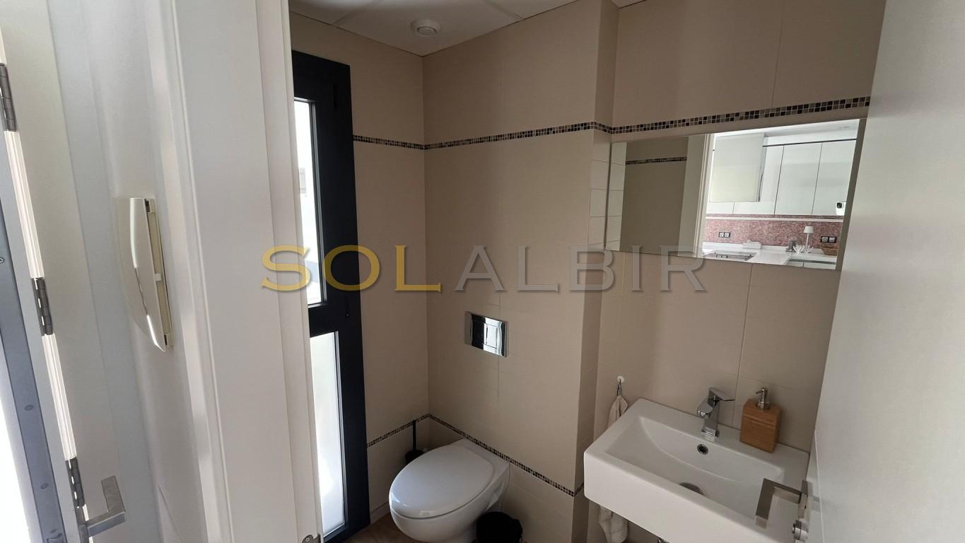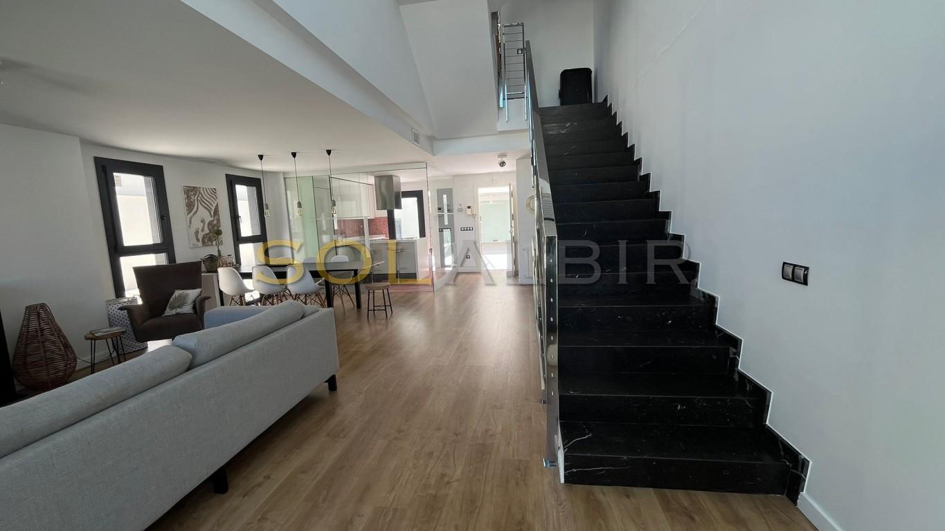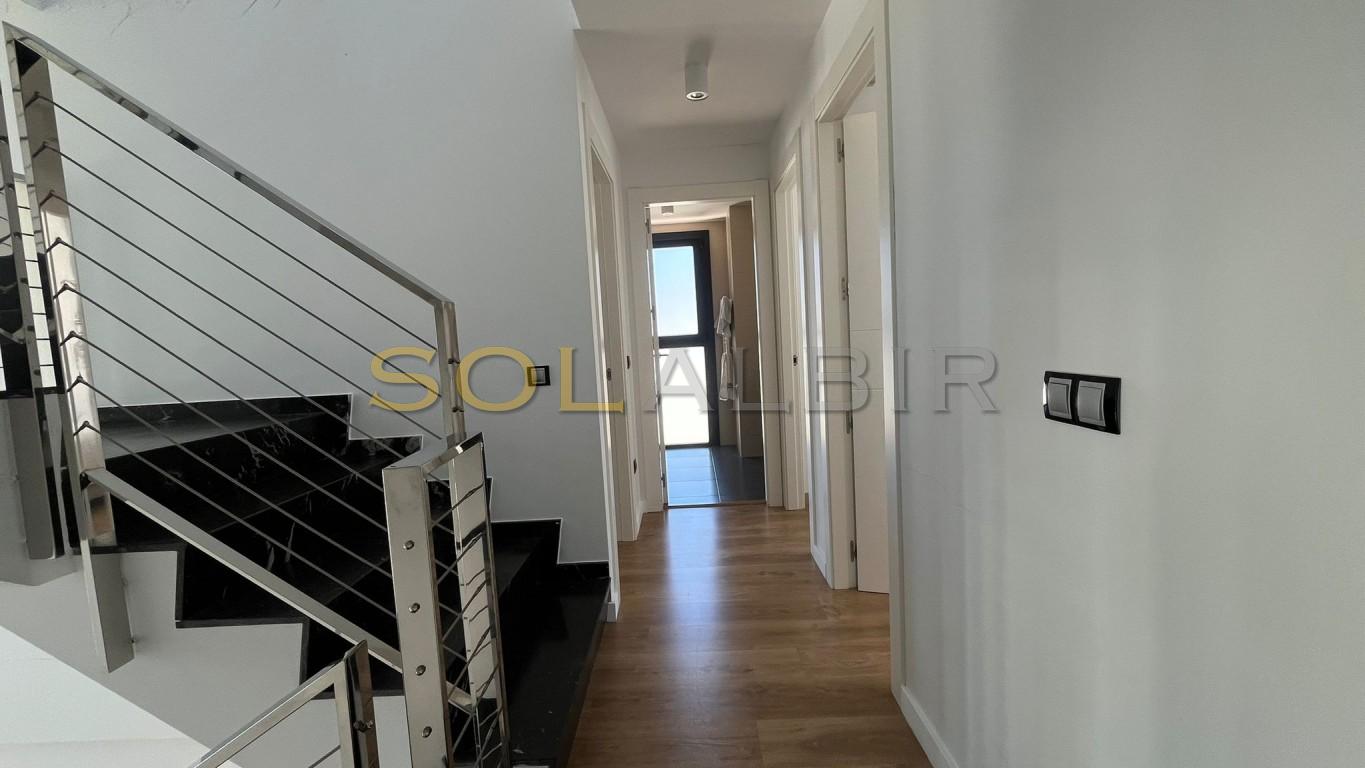 Denne vakre, moderne eiendommen kombinerer plass, komfort og luksus på en unik måte. Takket være de store vinduene har den romslige stuen rikelig med naturlig lys, noe som skaper et åpent og hyggelig bomiljø. Eiendommen har et fullt utstyrt kjøkken og et separat gjestetoalett i første etasje, ideelt for hverdagsliv og for å underholde gjester. I første etasje er det 3 romslige soverom og 2 stilige bad, ferdig med materialer av høy kvalitet. Andre etasje har tilgang til en takterrasse med vakker havutsikt; det perfekte stedet å slappe av, nyte solen eller spise. I kjelleretasjen har vi en enorm garasje med parkering for flere biler og rikelig med ekstra bodplass. Prikken over i-en er det "jomfruelige" rommet utenfor terrassen på ytterligere 60 kvm for et privat treningsstudio, kontor, spillrom... you name it! Kom og se selv. Bestill visning hos oss i dag og begynn å nyte ditt nye hjem i Albir.