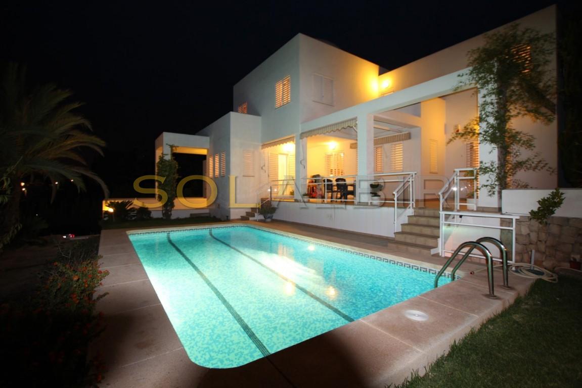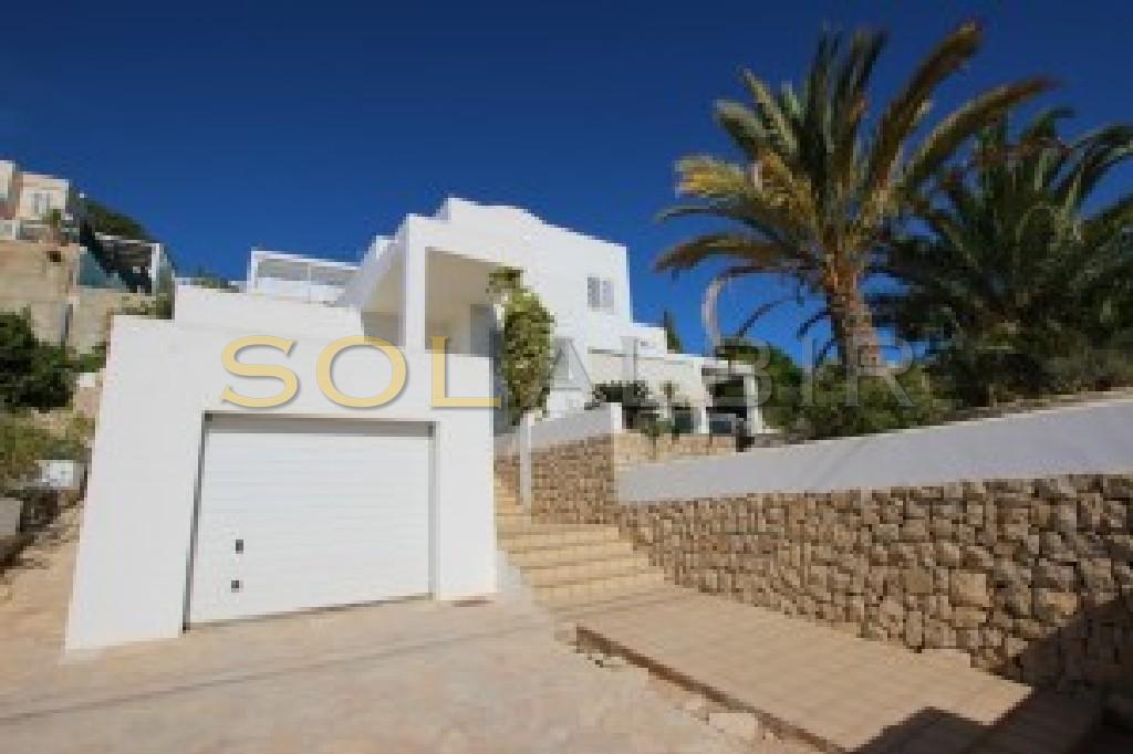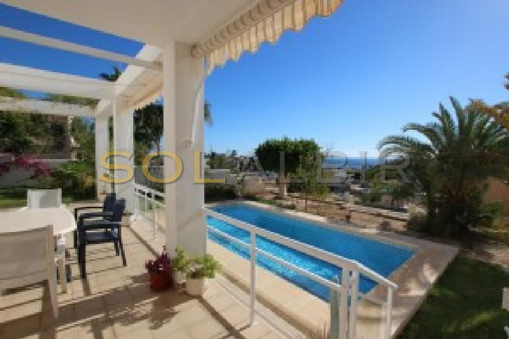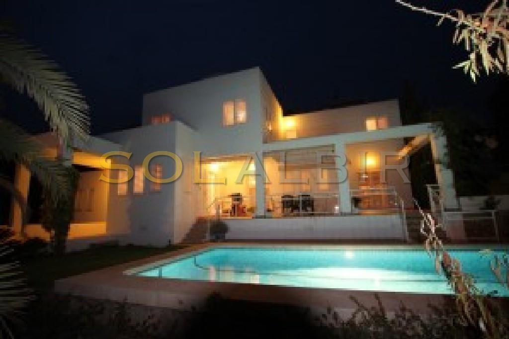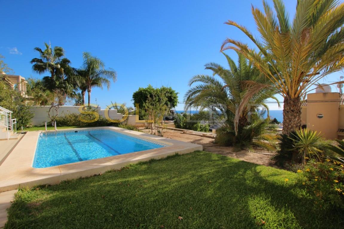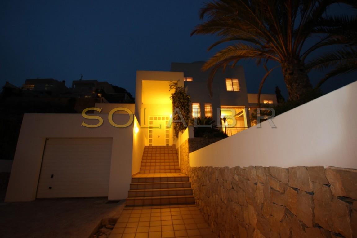 MODERNE MIDDELHAVSSTIL VILLA MED PANORAMAUDSIGT !!!! En eiendom bygget i 1997, av eieren - for seg selv! Gangavstand fra ulike vakre strender. En kilometer til nærmeste butikk og restaurant. 2,5 km til den vakre gamlebyen og strandpromenaden i Villajoyosa. En høy kvalitet eiendom med mange muligheter. Fra den højtloftede entrè er der adgang til: et gjestetoalett, et separat kjøkken med vaskerom, et kontor/soverom, en TV salong/soverom og en stor stue, som har en biblioteks afdeling med peis. Fra stuen og TV salongen er det utgang til terrasse med utsikt over bassenget, hagen og sjøen. Kjøkkenet har direkte tilgang til en sørøst vendt terrasse. Hele stueetagen har marmorgulv, med unntak av kjøkken og bad. I første etasje er to store soverom som deler et bad. Og så . . . master soverommet med garderobe korridor, bad én suite og en privat solterrasse. Første etasje har parketgolv bortsett fra badene. Fra gangen i første etasje du kommer til en stor solterrasse med panoramautsikt. Ulike muligheter for at udvidde eller overdække denne terrasse. På bakkenivå, ved siden av en to-bil-garasje, er yderligere et rom, som kan brukes som soverom, kontor eller bod. Hage med Middelhavet planter, naturlig gress og noen frukttrær. Gode oppbevaringsmuligheter i et stort rom under huset. Her ligger også maskineriet for bassenget og gassolje tank for sentralfyr. En klassisk moderne presentabel eiendom i god stand og med perfekt beliggenhet.