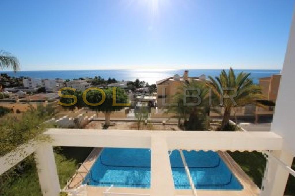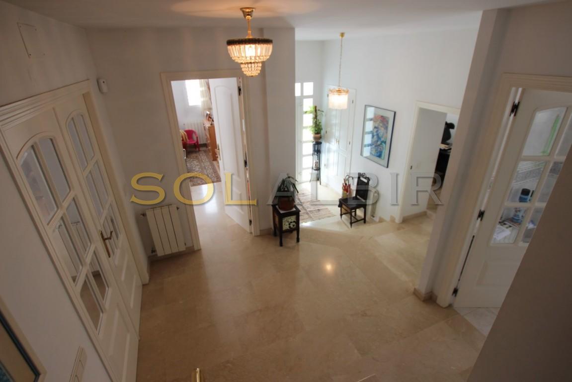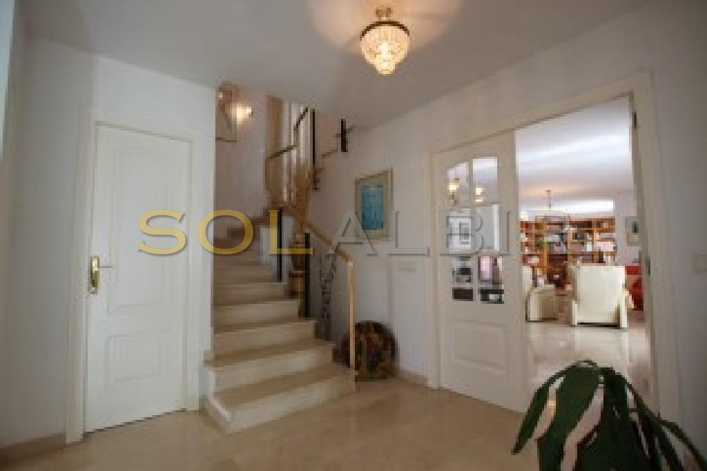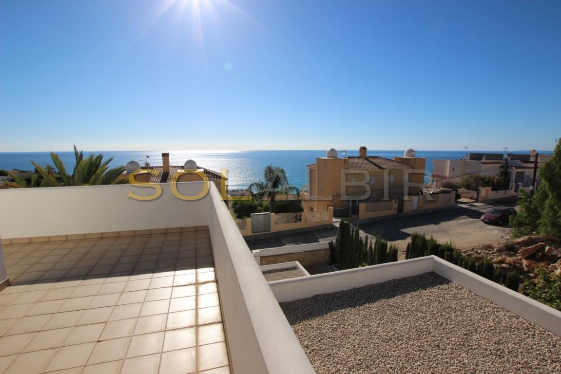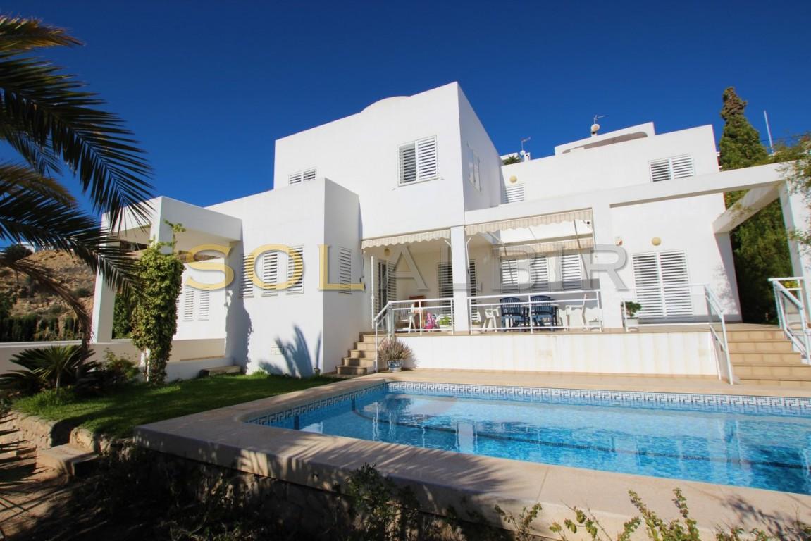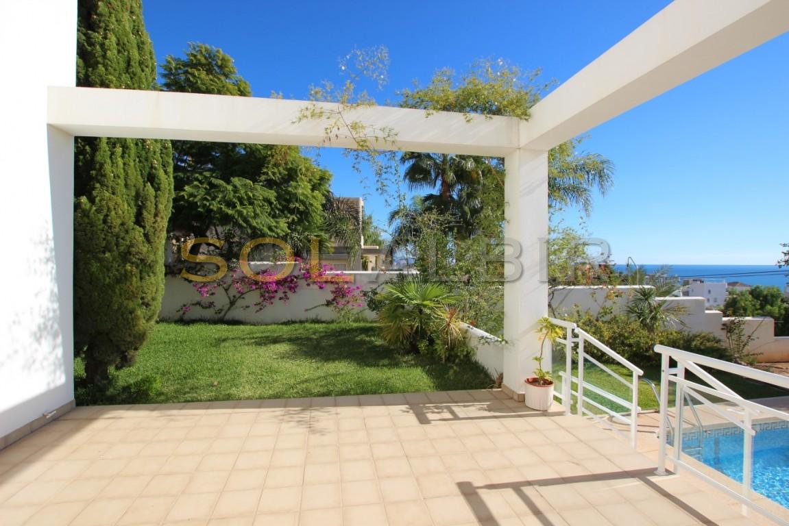 MODERNE MIDDELHAVSSTIL VILLA MED PANORAMAUDSIGT !!!! En eiendom bygget i 1997, av eieren - for seg selv! Gangavstand fra ulike vakre strender. En kilometer til nærmeste butikk og restaurant. 2,5 km til den vakre gamlebyen og strandpromenaden i Villajoyosa. En høy kvalitet eiendom med mange muligheter. Fra den højtloftede entrè er der adgang til: et gjestetoalett, et separat kjøkken med vaskerom, et kontor/soverom, en TV salong/soverom og en stor stue, som har en biblioteks afdeling med peis. Fra stuen og TV salongen er det utgang til terrasse med utsikt over bassenget, hagen og sjøen. Kjøkkenet har direkte tilgang til en sørøst vendt terrasse. Hele stueetagen har marmorgulv, med unntak av kjøkken og bad. I første etasje er to store soverom som deler et bad. Og så . . . master soverommet med garderobe korridor, bad én suite og en privat solterrasse. Første etasje har parketgolv bortsett fra badene. Fra gangen i første etasje du kommer til en stor solterrasse med panoramautsikt. Ulike muligheter for at udvidde eller overdække denne terrasse. På bakkenivå, ved siden av en to-bil-garasje, er yderligere et rom, som kan brukes som soverom, kontor eller bod. Hage med Middelhavet planter, naturlig gress og noen frukttrær. Gode oppbevaringsmuligheter i et stort rom under huset. Her ligger også maskineriet for bassenget og gassolje tank for sentralfyr. En klassisk moderne presentabel eiendom i god stand og med perfekt beliggenhet.