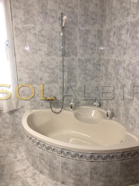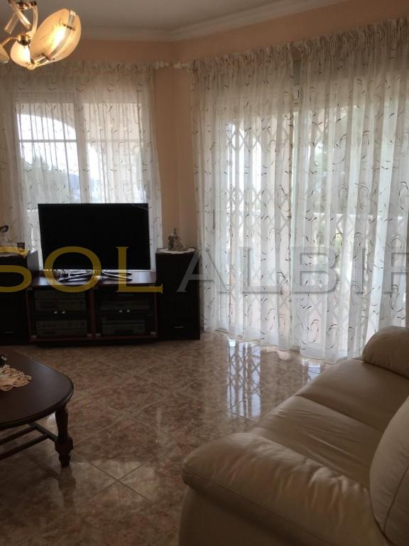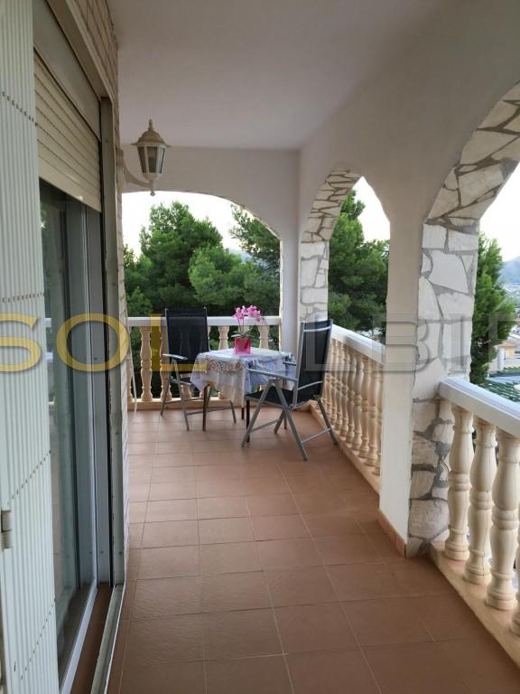 Mediterranean two storey villa with sea and mountain views for sale in La Nucia. It is a solidly built villa with double exterior walls and double glazed windows. It has access from both streets, the first access leads directly to the ground floor of the house and the second access leads to the garage, gymnasium and a large storage room. It has a large kitchen with dining room and gallery with storage room, washing machine, TV room, dining room, living room with fireplace, three double bedrooms with fitted wardrobes, an en suite bathroom with shower and a complete bathroom with bathtub. All rooms have exterior windows and it is all on one floor. The terraces are covered and the villa has air conditioning, electric hot water, gas and electric cooker, satellite TV and Spanish TV aerial. It also has fibre optic internet, landline telephone and alarm system. In the basement is the double garage with electric doors, a large room currently used as a gymnasium and a large storage room. The plot with garden is 1008m2. The garden is easy to maintain with irrigation system. On the plot it is possible to build a swimming pool. The area is very quiet, with wonderful sea and mountain views, close to all necessary services and Eliasn's English school. It is a very well maintained villa ready to move into. If you are looking for a two storey villa with sea and mountain views, close to the English school, this is your opportunity. For more information call our office.