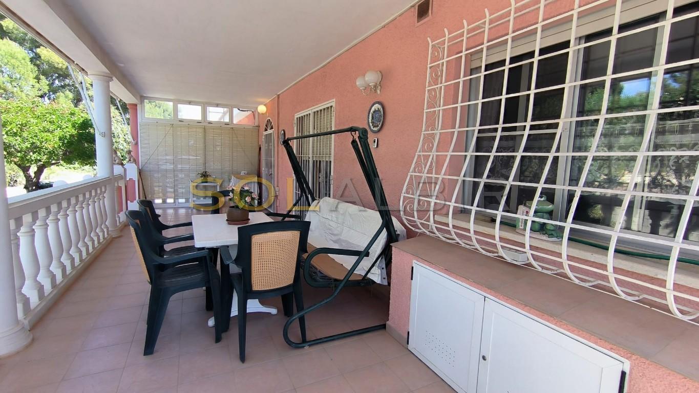 There are 4 bedrooms, the master bedroom with a covered terrace and direct access to garden. In addition there are 3 bathrooms. The kitchen is independent and has space for daily dining. Garage for 1 car, and additional covered parking area. In the exterior is the BBQ, toilet and shower in garden and a very large storage room. The fantastic plot is flat and with fruit trees, rural feel but in a central urbanisation. Although the villa will benefit from some cosmetic modernisation, this is a great villa.