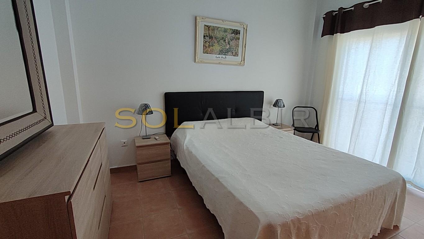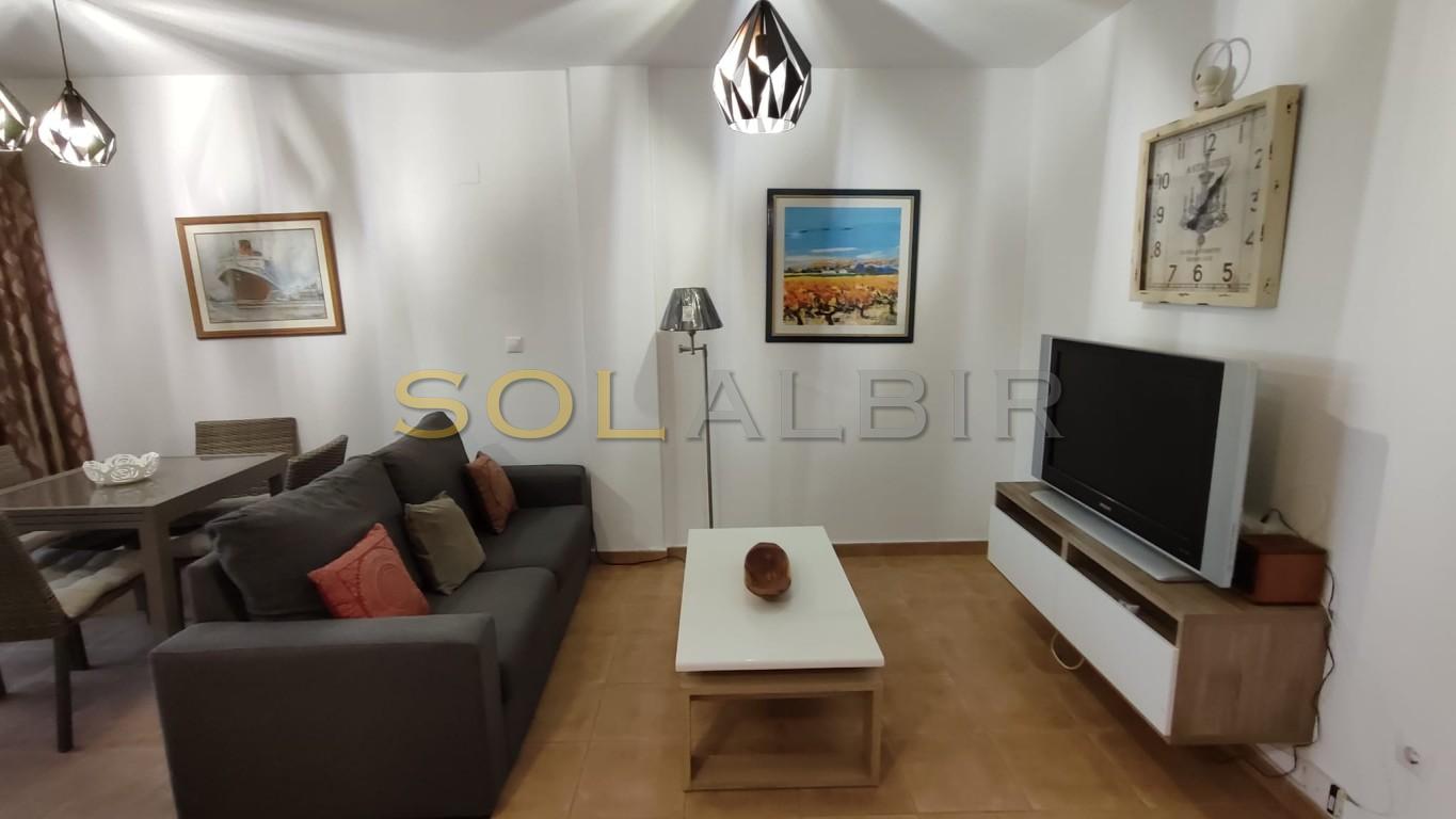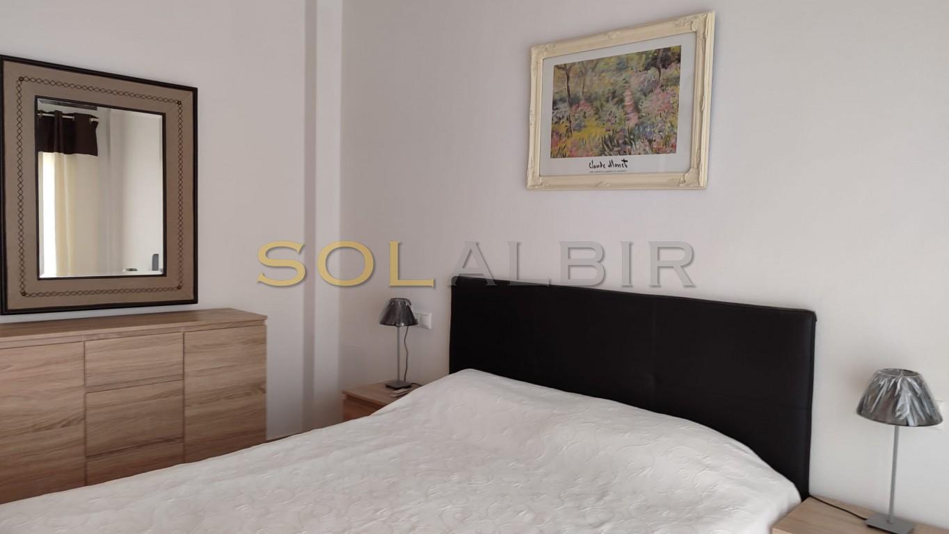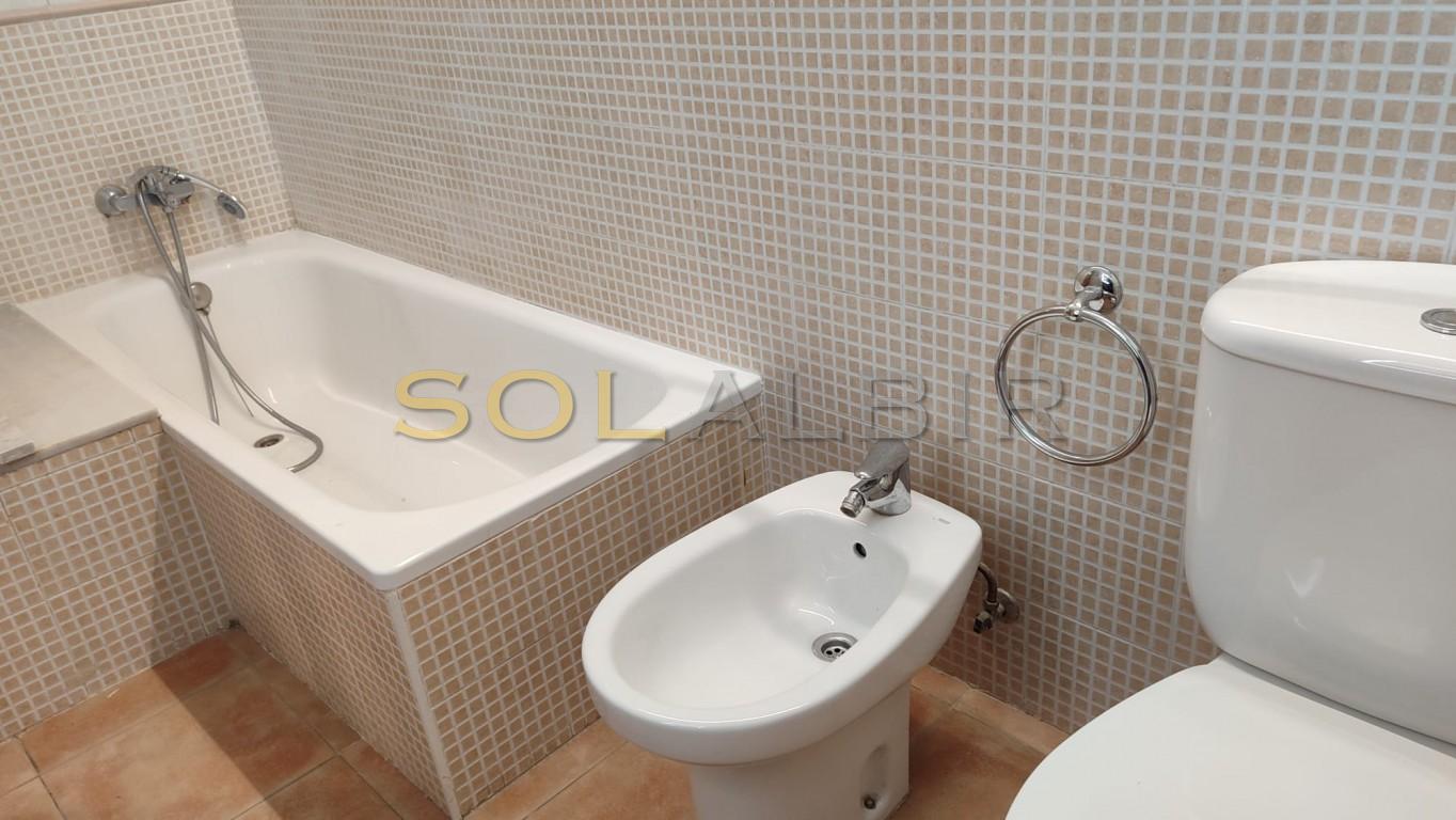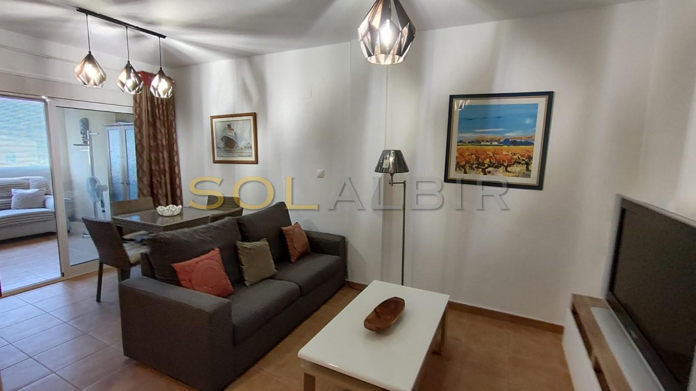 GOOD SIZE 1 BEDROOM APARTMENT - CENTRALLY LOCATED IN ALBIR IN URBANISATION WITH POOL. The apartment can be attractive for long term rental, with a spacious living room with dining area and with a glazed in covered terrace with a sofabed, an open kitchen with a utility room with waching machine, and there is one bedroom, and a bathroom with bath tub. Air condition hot/cold in the apartment. Constructed area aprox 67 m2 and net area 50 m2. The price includes a parking space outdoor and a storage room aprox 9 m2 in the basement. Beautiful communal area with a pool and garden area in walking distance to all in Albir.