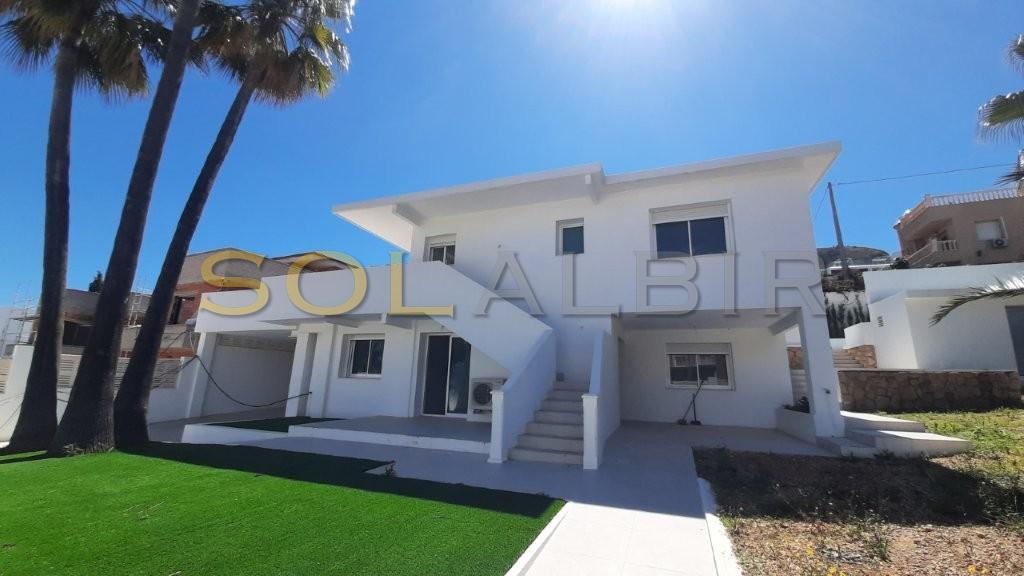 Completely refurbished independant villa on 2 levels in a quiet residential street in popular Albir. The ground level offers a spacious living area with open plan kitchen, 2 bedrooms and 2 bathrooms. On the upper level we have another living area with open plan kitchen, opening up unto a large sunroof style terrace with panoramic views. A bedroom with ensuite bathroom, and another bedroom and bathroom. A garage with driveway for extra parking leads directly into the house. The private pool with enormous terrace is located at the back of the property, which ensures total privacy. Ideal for a large family!!