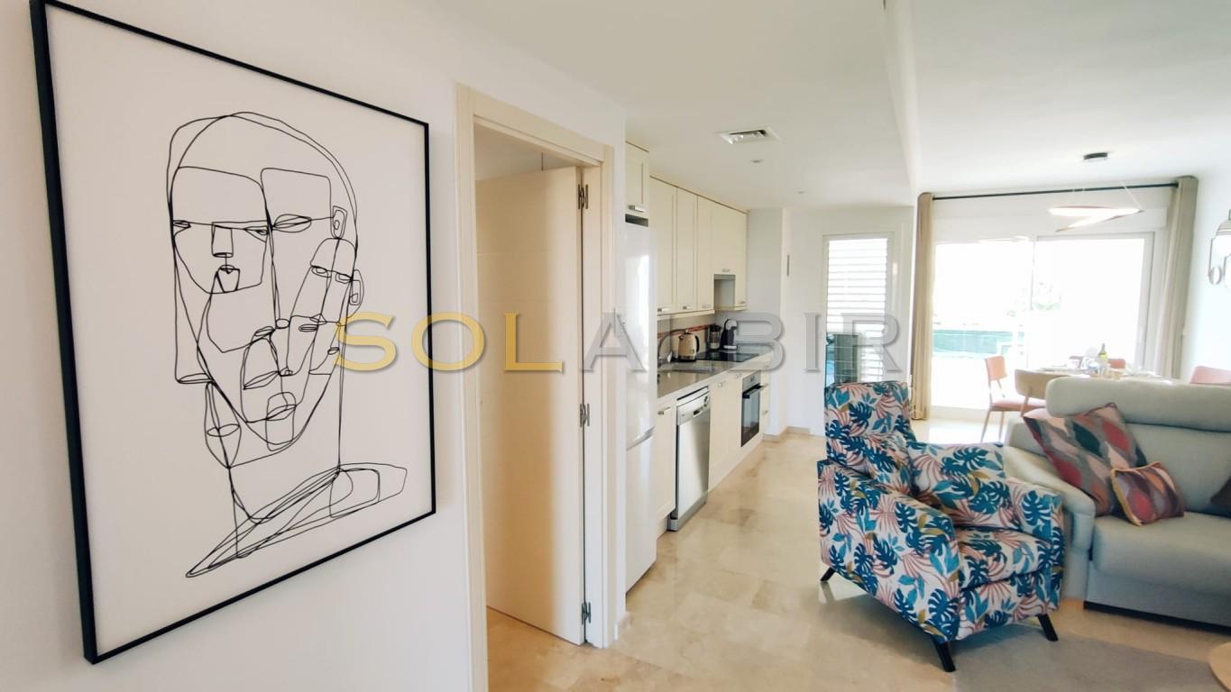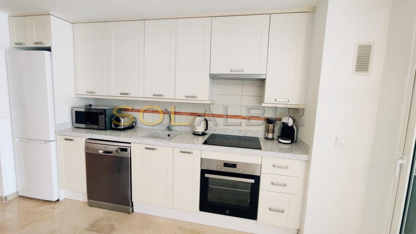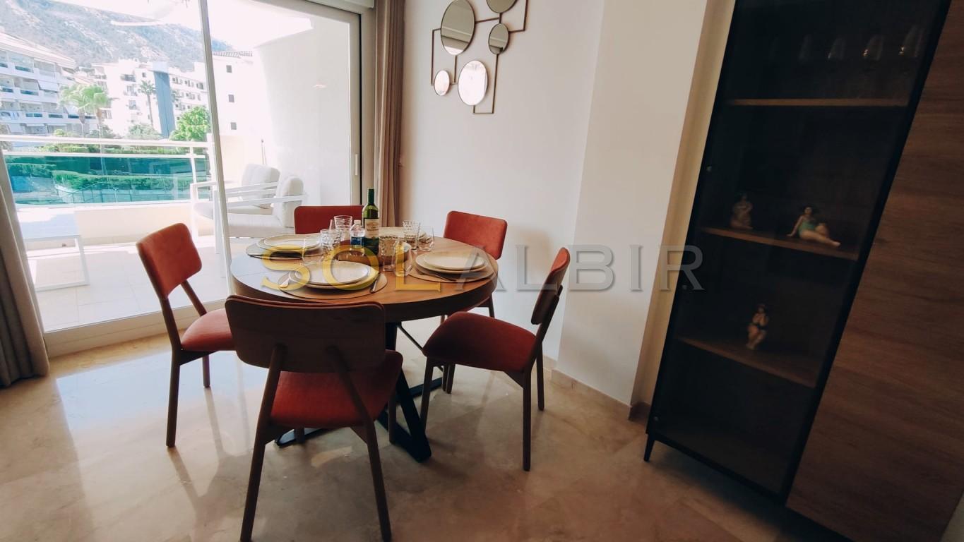 ELEGANT, MODERNISED AND SUNNY 2 BEDROOM APARTMENT WITH OPEN VIEWS. This is a unique apartment, aprox 93 m2 constructed area incl terrace, it was modernised in 2024 and has a bright and spacious living room with dining area and an open kitchen and exit to a sunny balcony with views to the mountain and pool. Is beautifully decorated and with good quality furnitures. There are 2 good size bedrooms each with spacious fitted wardrobes and 2 bathrooms with shower, one is ensuite. In the price is included a garage space and a storage room. The complex is one of the few in Albir with a heated pool and jacuzzi, and in addition there is an open pool, paddle tennis court and a play area for children. Is located very centrally in Albir, with a short walking distance to the beach, the golf court, shops, restaurants and public transport in Albir.