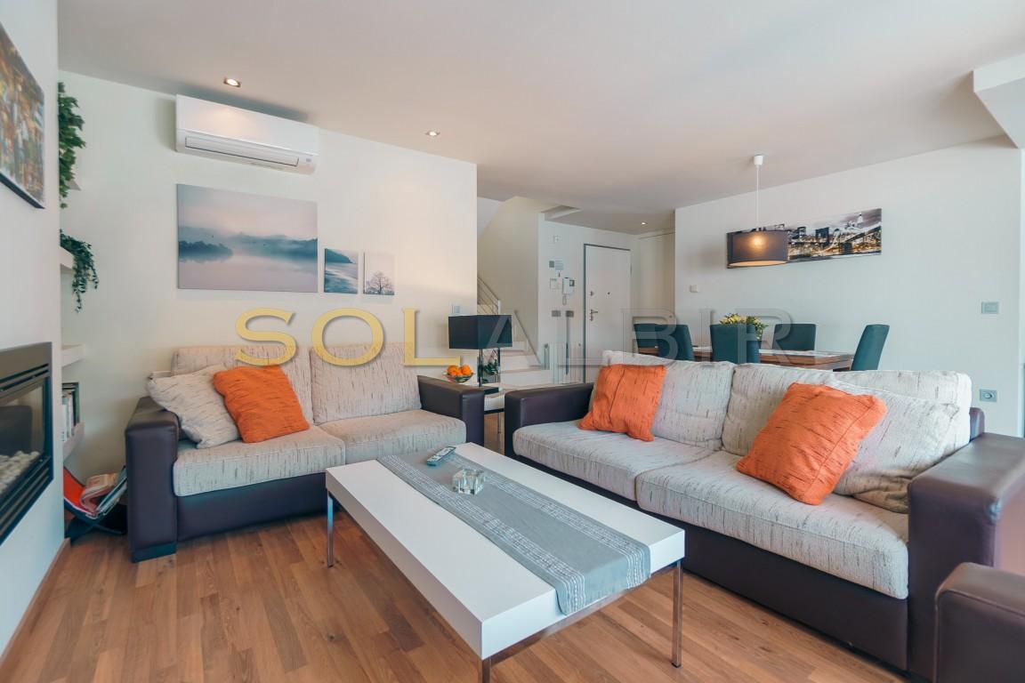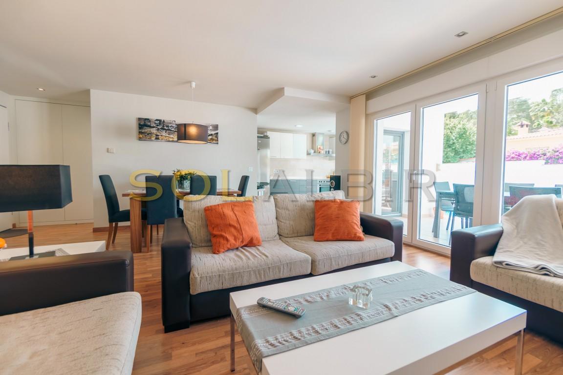 On the ground floor, you will find a spacious living-dining room with an open kitchen, one bedroom, and a full bathroom, which is very convenient. The upper floor has another three bedrooms, all with fully fitted built-in wardrobes. The master bedroom has an en-suite bathroom and direct access to a private terrace.