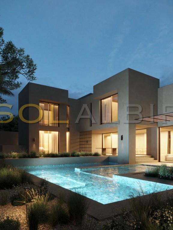 The outdoor space, follows the same geometric composition, as the house, which creates a feeling of continuity, and an allianze between the interior, and the exterior. Textures on the ground, such as the pavement, the pool and the garden areas, are intelligently combined to enhance of the geometry of the plot. This not only gives a modern, and sophisticated look to the space, but it also creates a sense of order, and balance. The swimming pool is a central feature in the garden design. Its irregular shape, is related to the composition of the facade, and the geometry of the house in plan, which adds coherence to the overall design. Additionally, the pool is strategically located to serve as an exterior connection between the different levels of the plot, and the house. One of the main challenges in the design of the garden, was to achieve the privacy of CasaEME, without limiting the sea views, that can be seen, from the first floor of the house. To address this challenge, a carefully planned landscaping project, has been implemented. Natural elements, such as bushes, trees and different plant species, have been used to create a visual barrier, that prevents neighbor plots from interfering with the privacy of the interior, of the plot. The exterior lighting, is designed in line with the volumes, and geometry of the house. The different cubes and levels of the house, are strategically highlighted by placing lights, at specific points. This creates a play of light, and shadows, that emphasizes the architectural structure, enhancing the irregular composition of the fasade.
