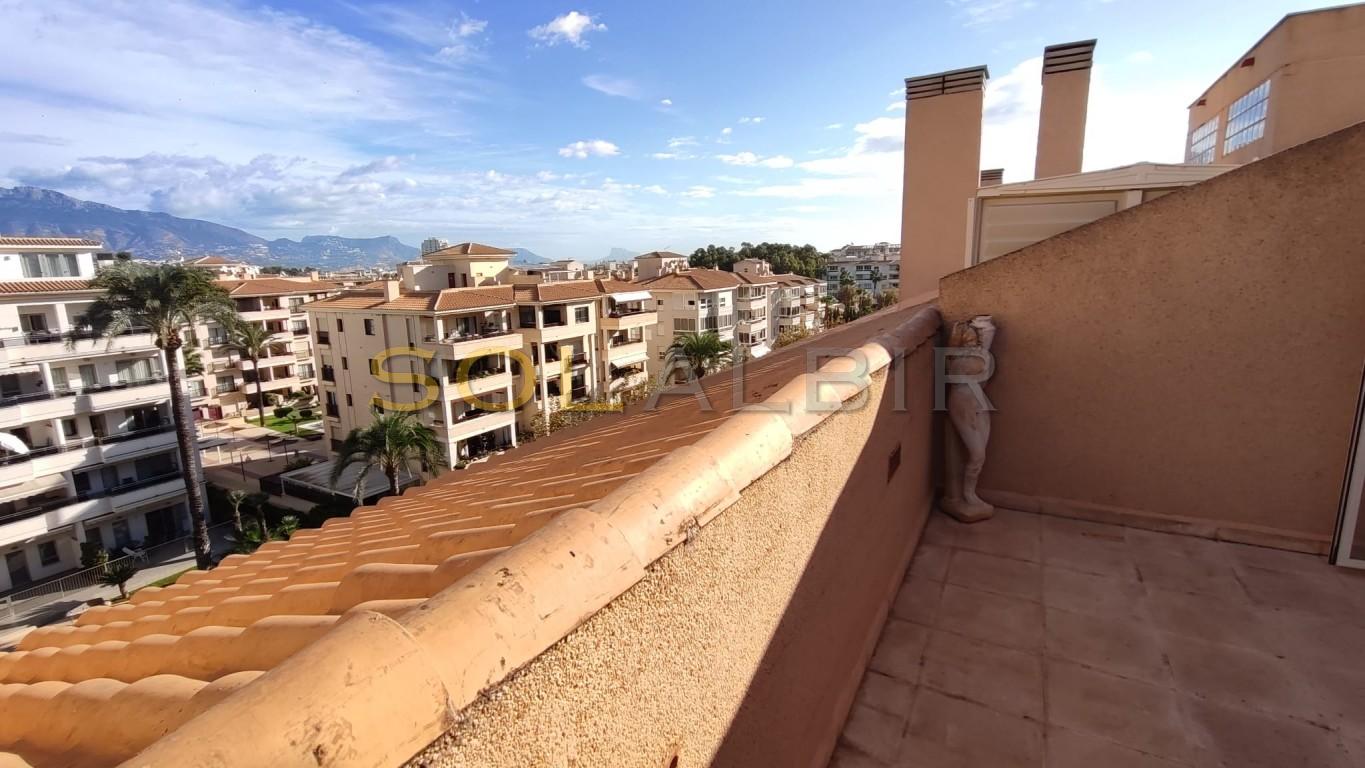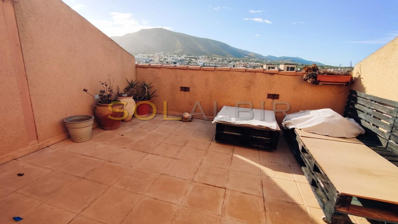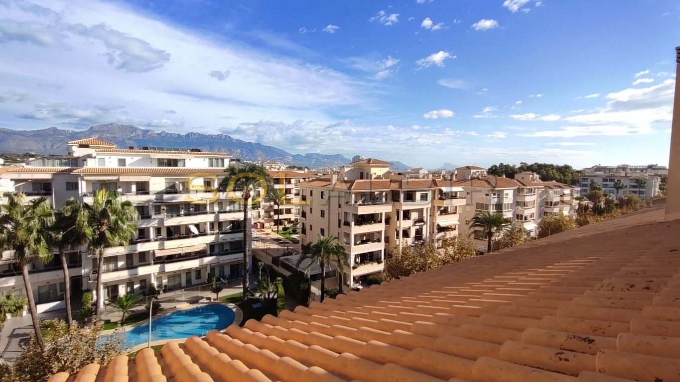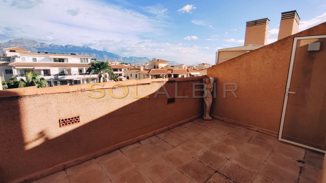 SUNNY DUPLEX TOPFLOOR APARTMENT IN ATTRACTIVE URBANISATION CENTRALLY LOCATED IN ALBIR. Fantastic possibility to get a spacious and charming topfloor apartment with a large sunny roof terrace of aprox 36 m2 with beautiful views and many possibilities. On the main floor of aprox 63 m2 there is a spacious and bright living-dining room with exit to a large sunny terrace with views to the communal garden with pool and the mountains, there is a semi-open kitchen, and at the main floor is 1 bedroom and 1 bathroom. The property is located in a very attractive complex, which offers a community pool, paddle courts and play area. A parking space in the basement is included in the price. Is located in short distance to the sea, restaurants, shops and public transport.