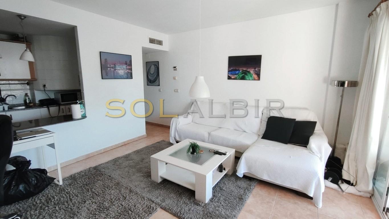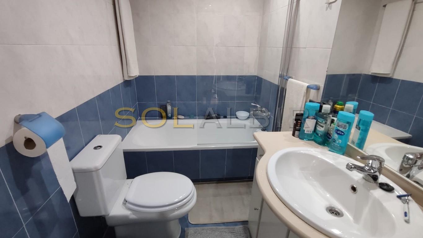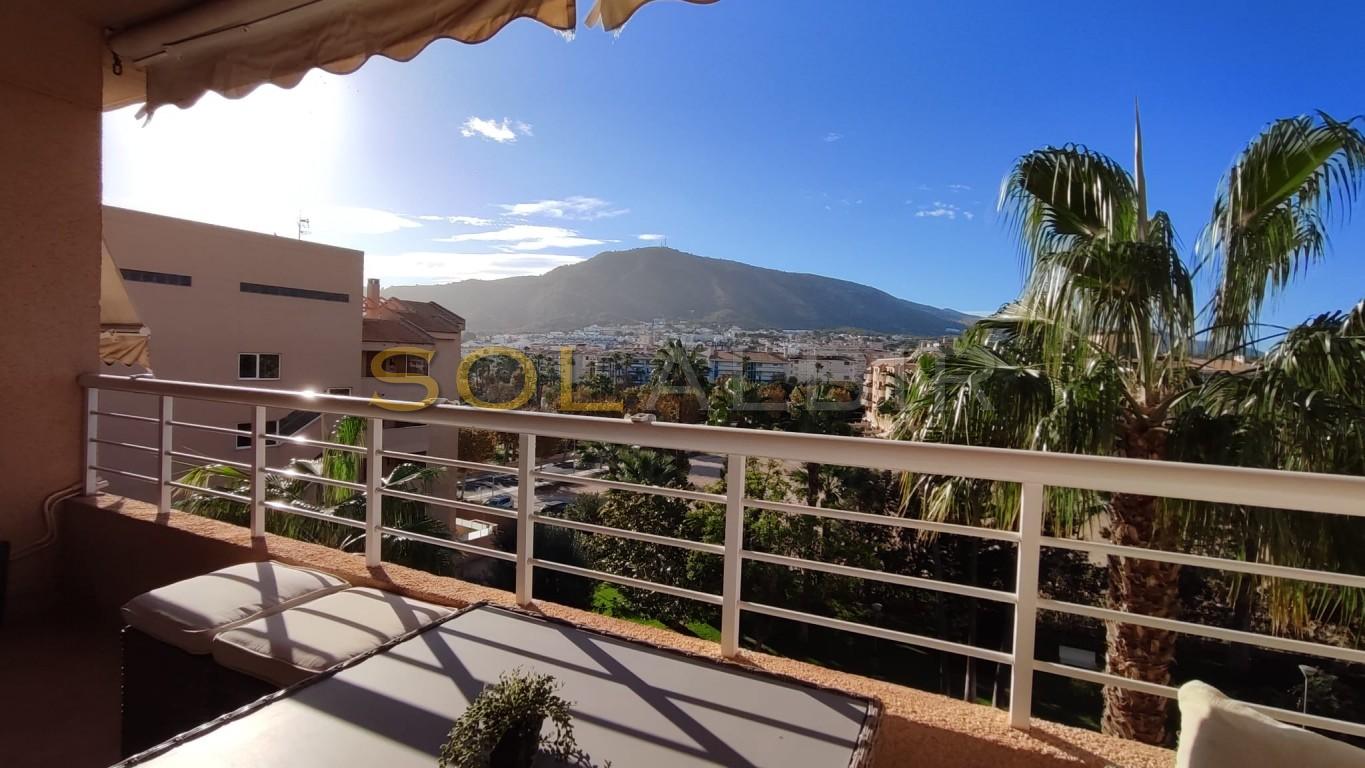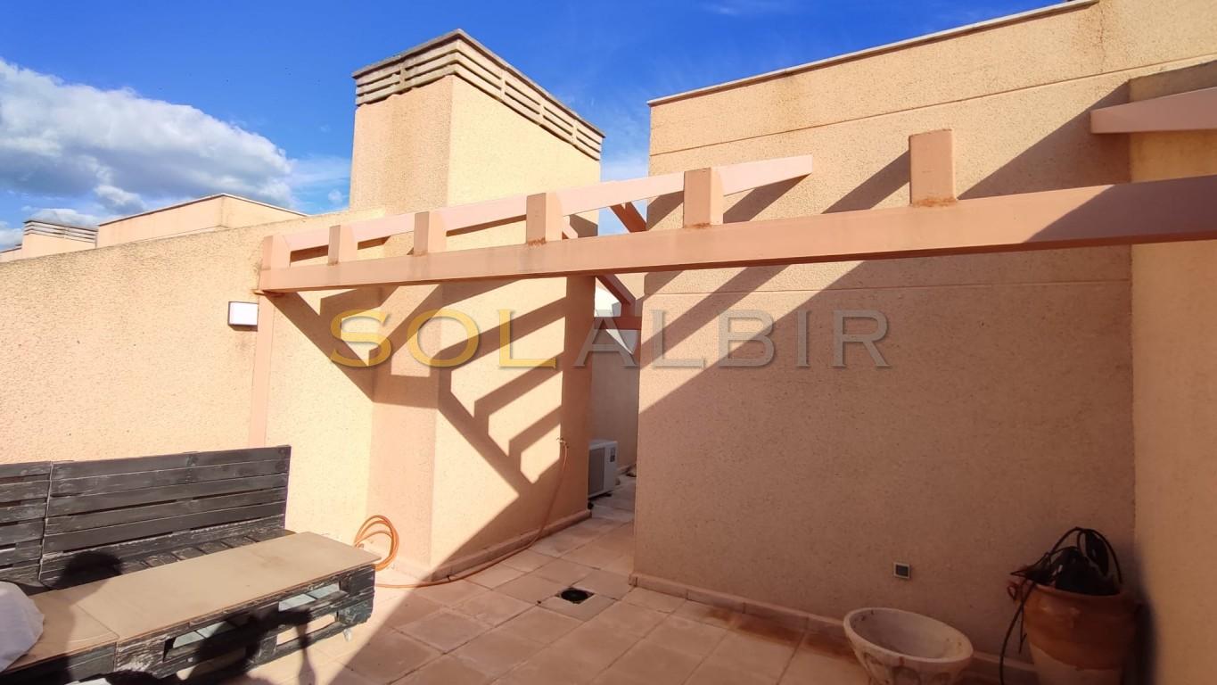 SUNNY DUPLEX TOPFLOOR APARTMENT IN ATTRACTIVE URBANISATION CENTRALLY LOCATED IN ALBIR. Fantastic possibility to get a spacious and charming topfloor apartment with a large sunny roof terrace of aprox 36 m2 with beautiful views and many possibilities. On the main floor of aprox 63 m2 there is a spacious and bright living-dining room with exit to a large sunny terrace with views to the communal garden with pool and the mountains, there is a semi-open kitchen, and at the main floor is 1 bedroom and 1 bathroom. The property is located in a very attractive complex, which offers a community pool, paddle courts and play area. A parking space in the basement is included in the price. Is located in short distance to the sea, restaurants, shops and public transport.
