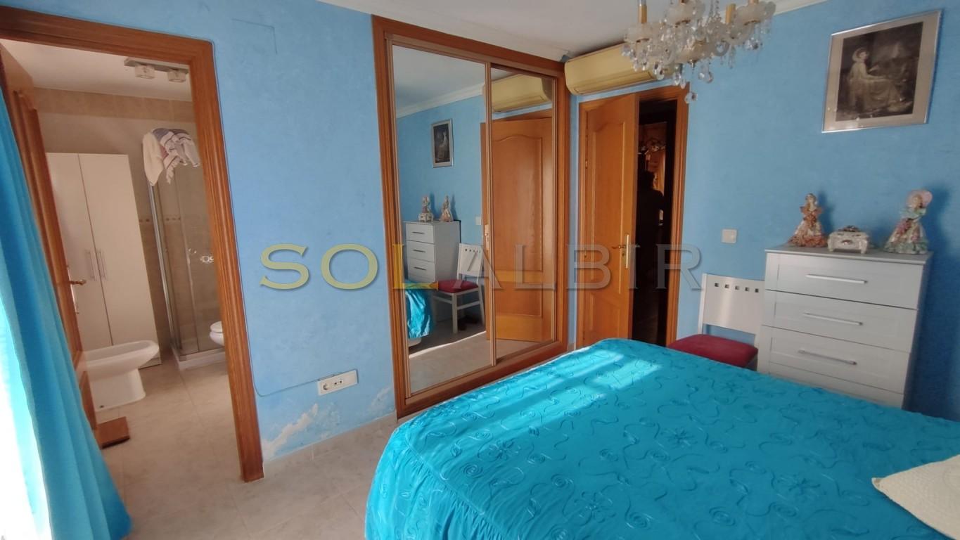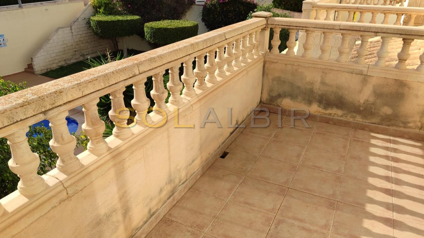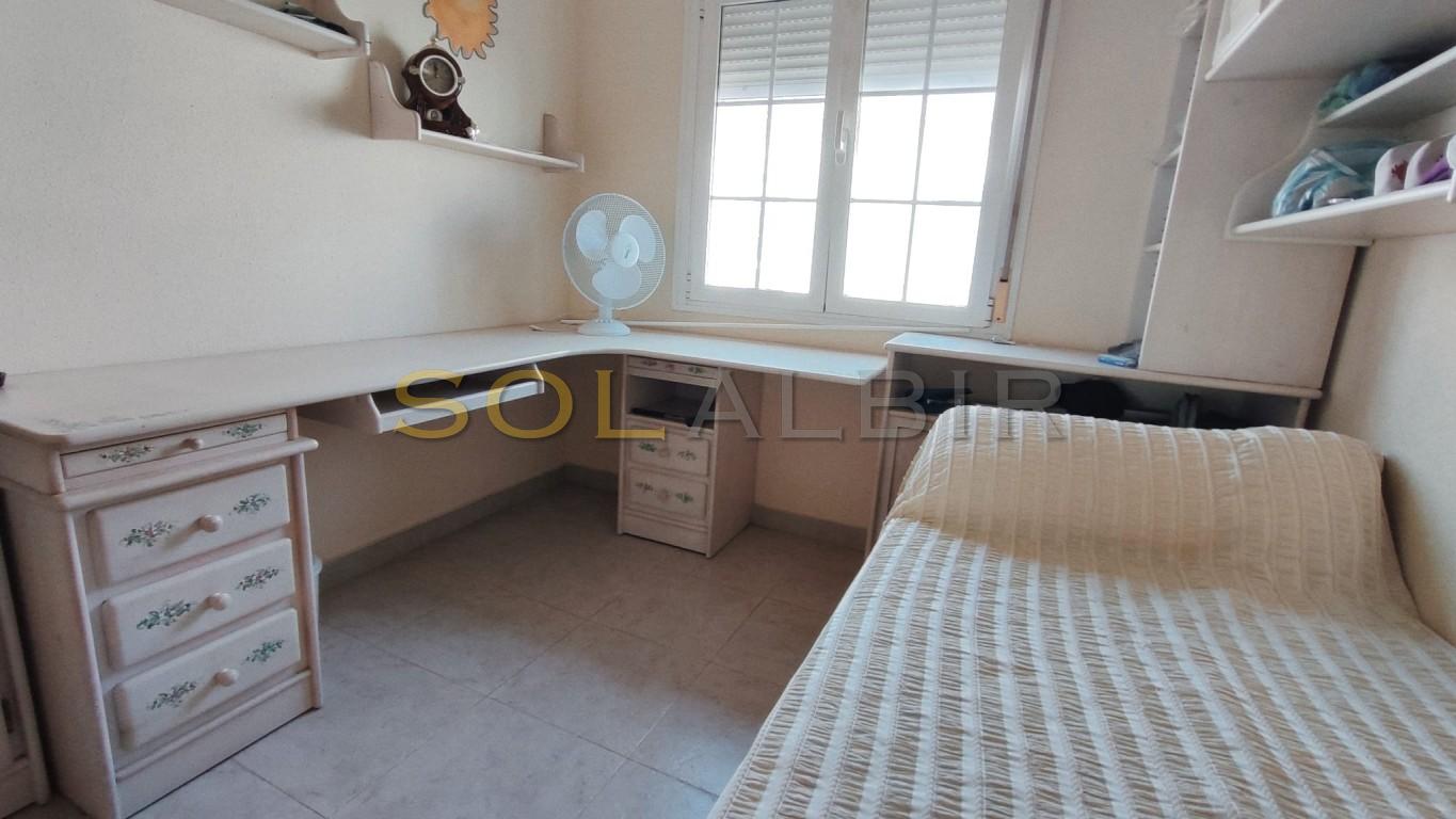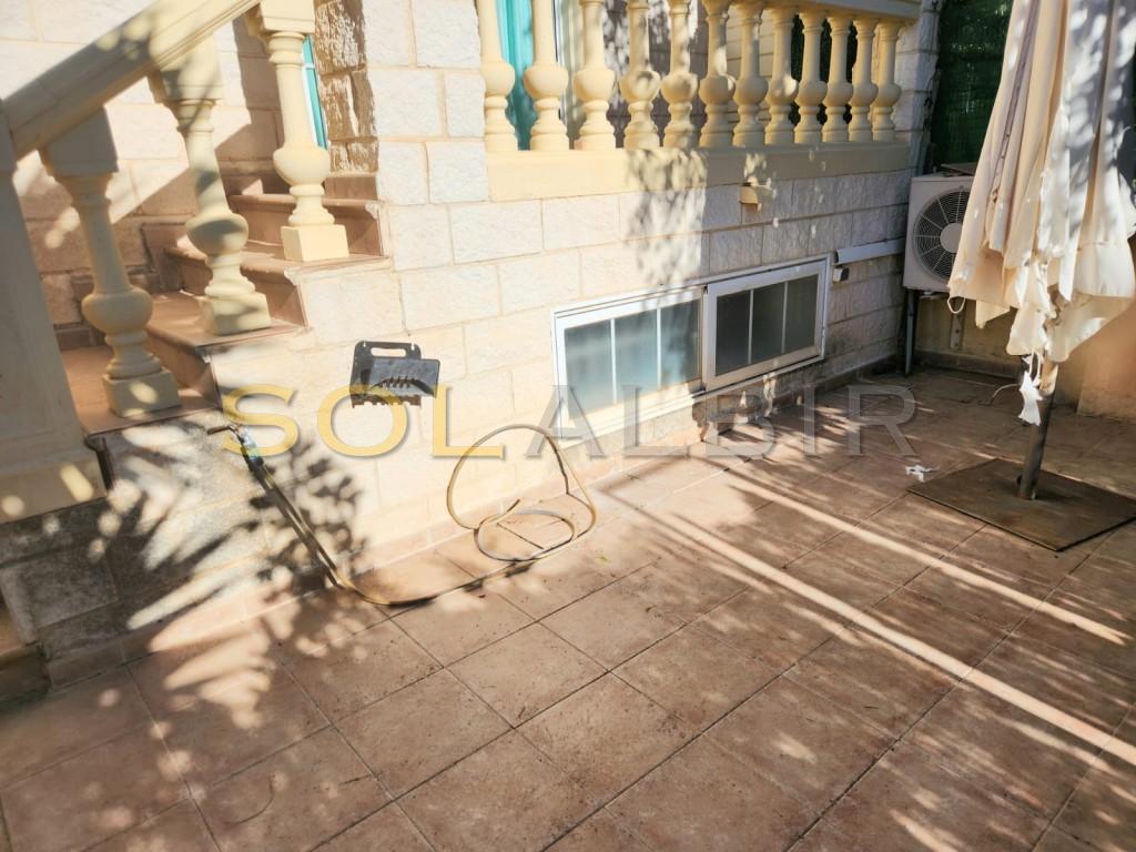TOWNHOUSE WITH 3 FLOORS and SOUTH FACING TERRACE AND BALCONY IN POPULAR URBANISATION WITH COMMUNAL GARDEN WITH SWIMMING POOL. The property has 3 bedrooms with fitted wardrobes and 2 bath rooms on the first floor, one with shower is ensuite with the master bedroom and where there also is exit to a sunny balcon, the other bath room has a bath tub, at the ground floor there is a livingroom with dining area, the kitchen and a toilet. There is a spacious garage/room with many possibilities in the basement, and an internal staircase between the 3 floors. There is aircondition in the livingroom and the master bedroom, and preinstallation in the other 2 bedrooms. There is 166 m2 constructed area in total, with 46 m2 upstairs, 46 at the ground floor and 57 m2 in the basement, and a total of 52 m2 of terraces and balcony. There is alarm system in the townhouse and video installed in the urbanisation. There is a communal area with swimmingpool with access from the terrace of the townhouse and there is also a play area for children. The urbanisation is located in a quiet area in short distance to the Norwegian school in Albir and the Natura Park with a walk to the light house, and in walking distance to the center of Albir and the beach.