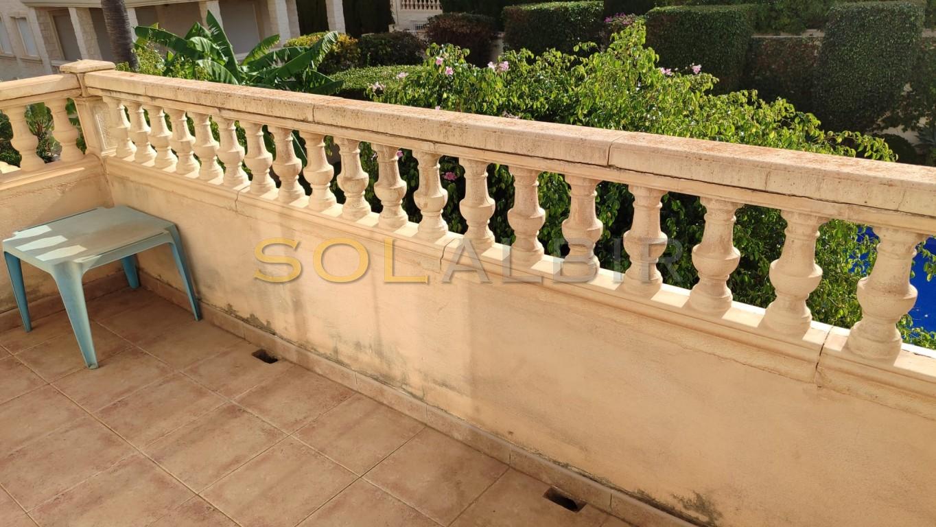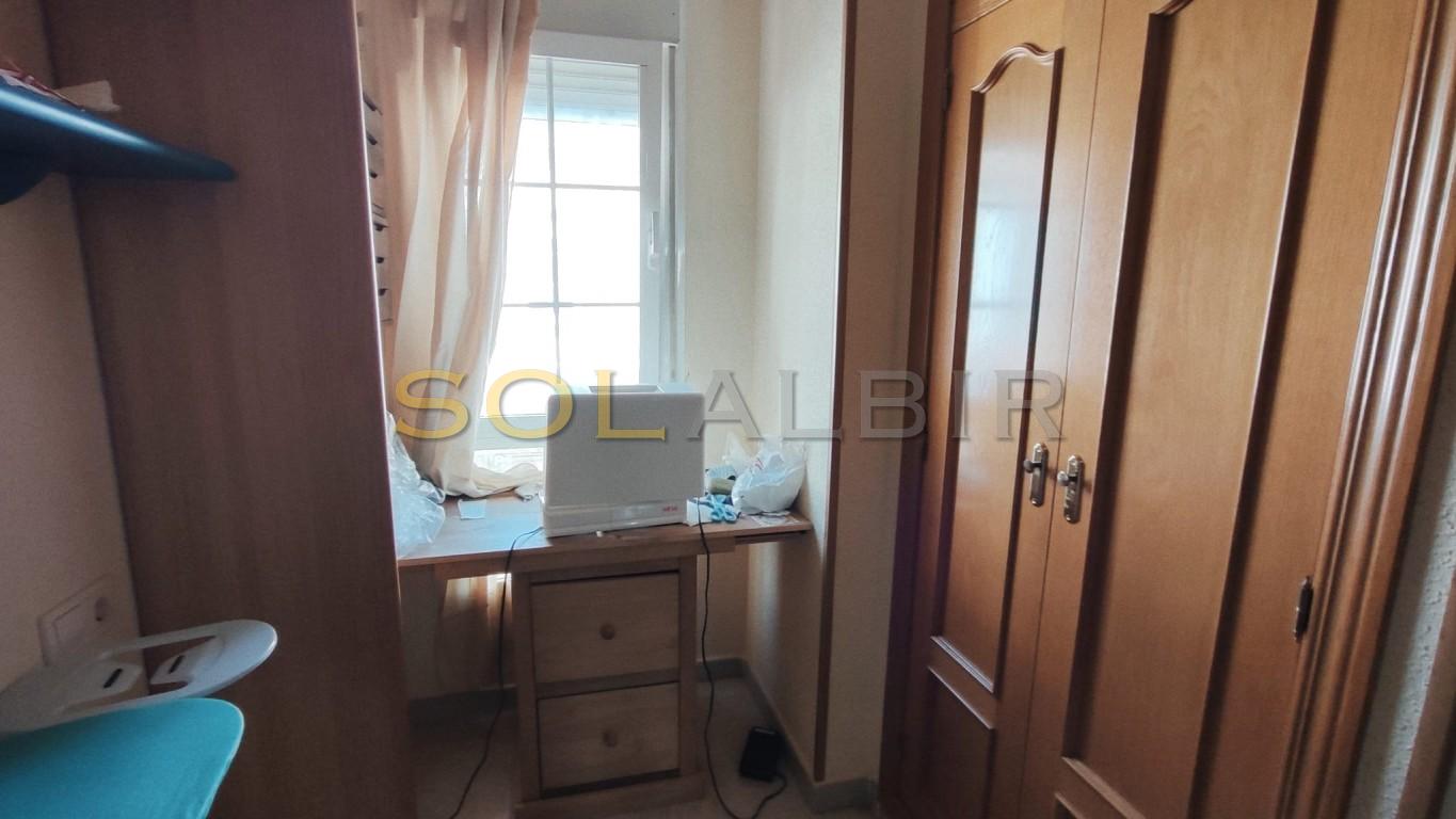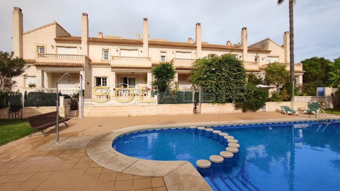 TOWNHOUSE WITH 3 FLOORS and SOUTH FACING TERRACE AND BALCONY IN POPULAR URBANISATION WITH COMMUNAL GARDEN WITH SWIMMING POOL. The property has 3 bedrooms with fitted wardrobes and 2 bath rooms on the first floor, one with shower is ensuite with the master bedroom and where there also is exit to a sunny balcon, the other bath room has a bath tub, at the ground floor there is a livingroom with dining area, the kitchen and a toilet. There is a spacious garage/room with many possibilities in the basement, and an internal staircase between the 3 floors. There is aircondition in the livingroom and the master bedroom, and preinstallation in the other 2 bedrooms. There is 166 m2 constructed area in total, with 46 m2 upstairs, 46 at the ground floor and 57 m2 in the basement, and a total of 52 m2 of terraces and balcony. There is alarm system in the townhouse and video installed in the urbanisation. There is a communal area with swimmingpool with access from the terrace of the townhouse and there is also a play area for children. The urbanisation is located in a quiet area in short distance to the Norwegian school in Albir and the Natura Park with a walk to the light house, and in walking distance to the center of Albir and the beach.