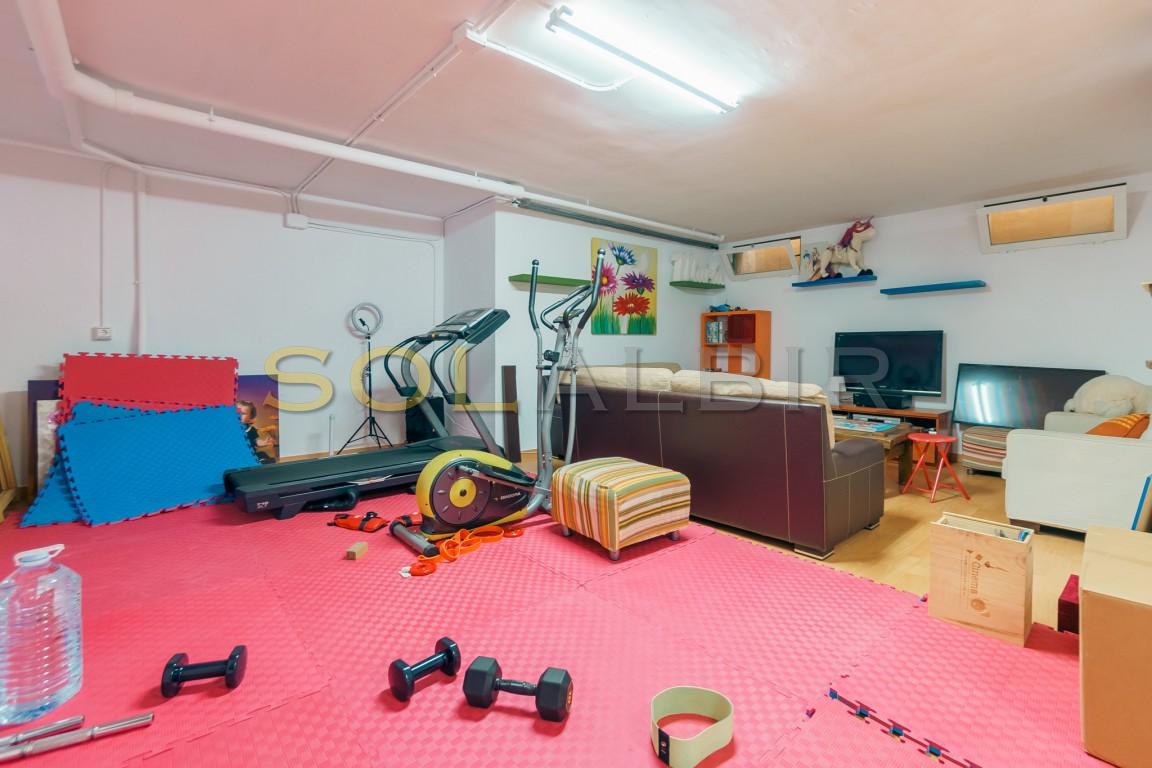 Upon entering, the ground floor includes a spacious and bright living-dining room, a fully equipped independent kitchen, a ground floor bedroom with a built-in wardrobe, and a bathroom with a shower. The basement of approximately 100 m² provides a versatile space for a TV area, home office, or even a gym.