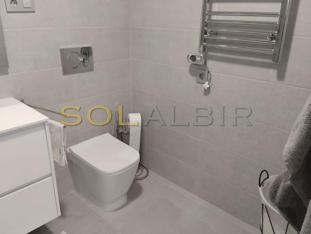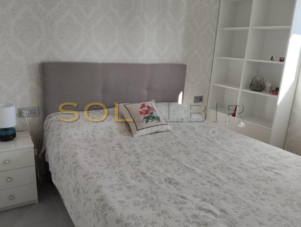 It is a luxury flat with three bedrooms and two bathrooms. It is 155 m² and is newly built. It has a fully equipped open-plan kitchen, living-dining room, pantry, storage room, and parking space. It has gardens, swimming pools, paddle tennis courts, a gym, and a children's playground.