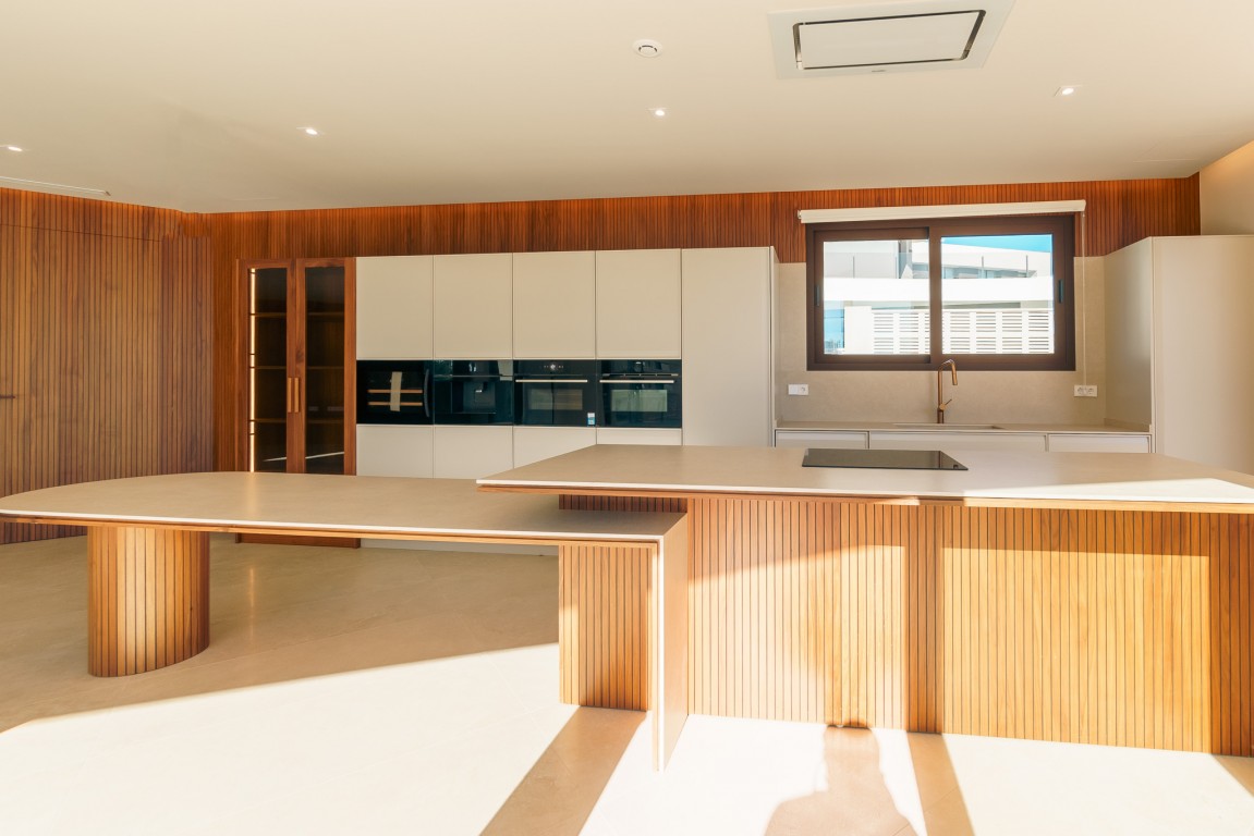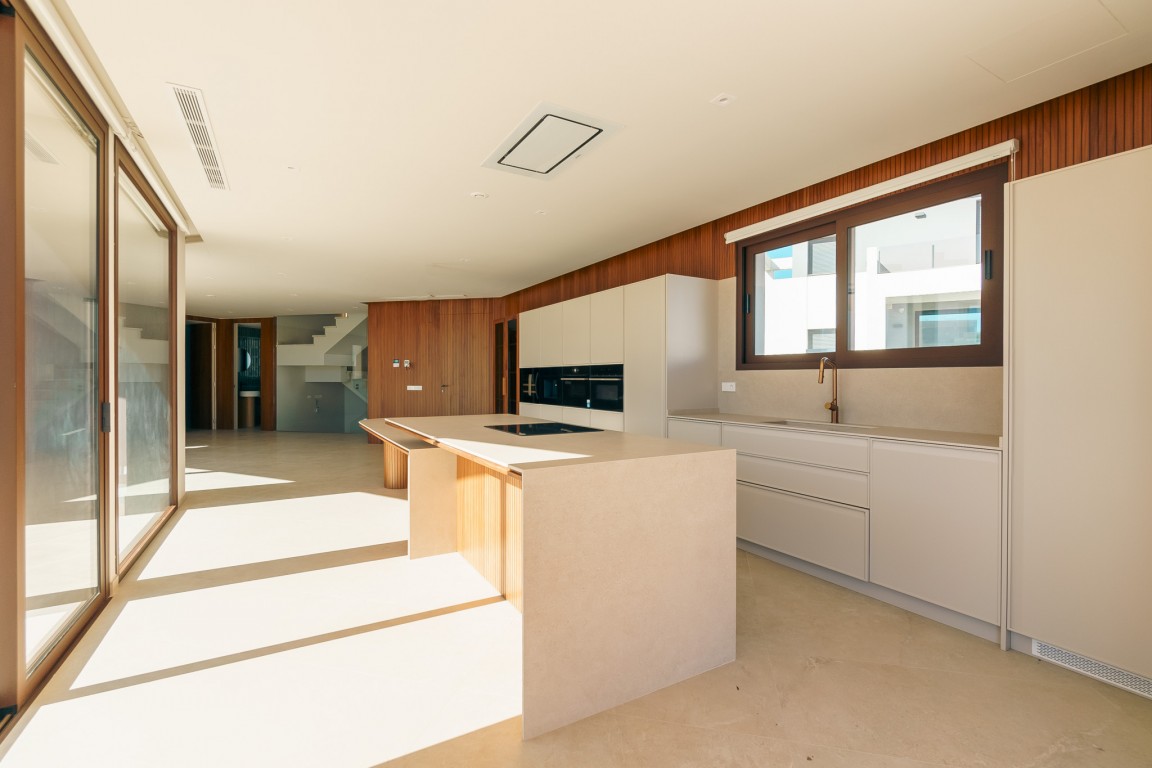 Contemporary interior design with large-format flooring and expansive windows. Modern open-plan kitchen connected to the living room, functional and elegant.