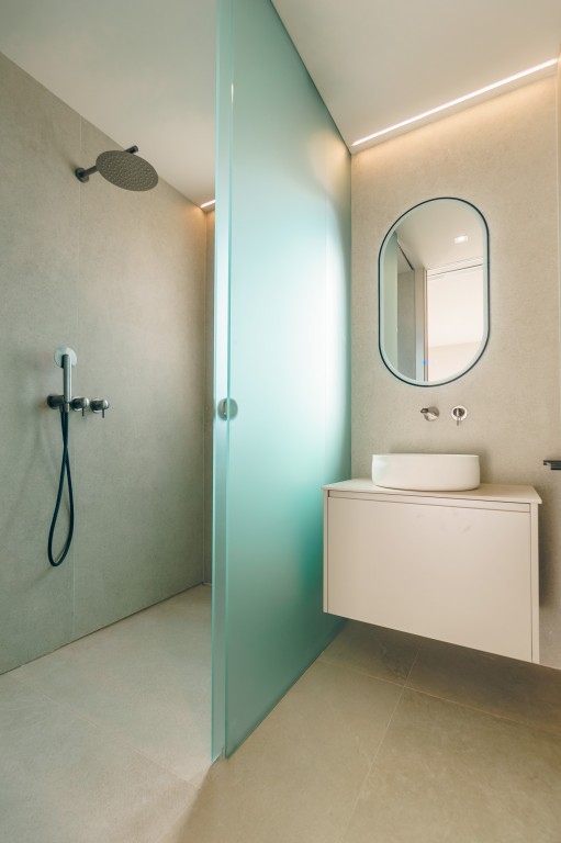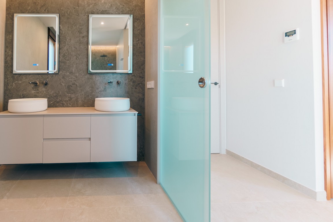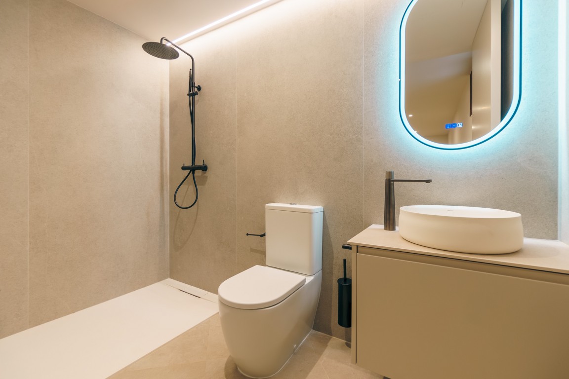 The property features 5 en-suite bedrooms and 5 bathrooms with stone-tone materials, ambient lighting and walk-in showers. The main suite includes a freestanding bathtub and double sink.