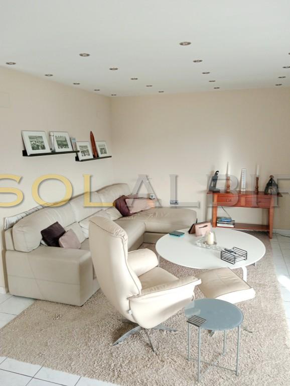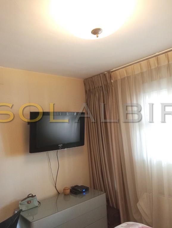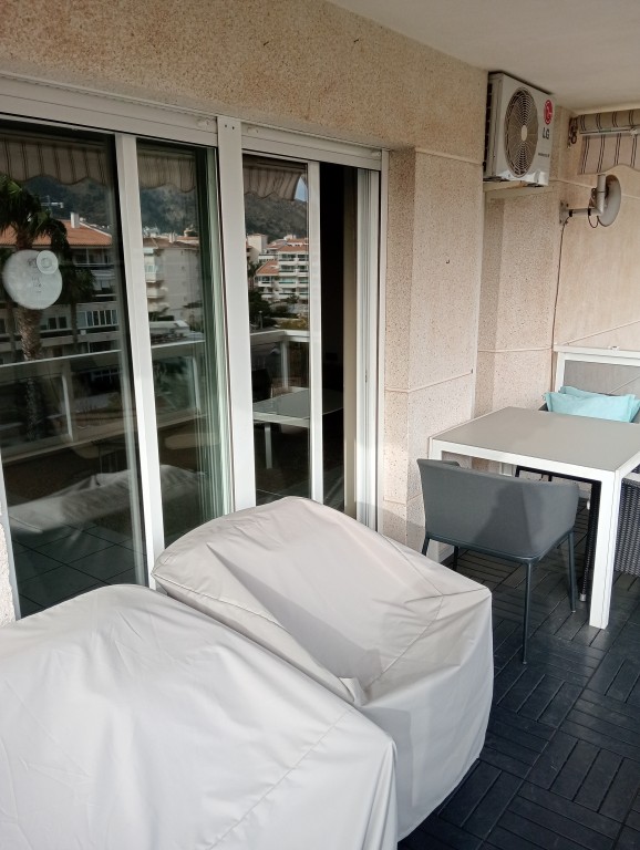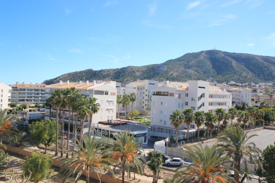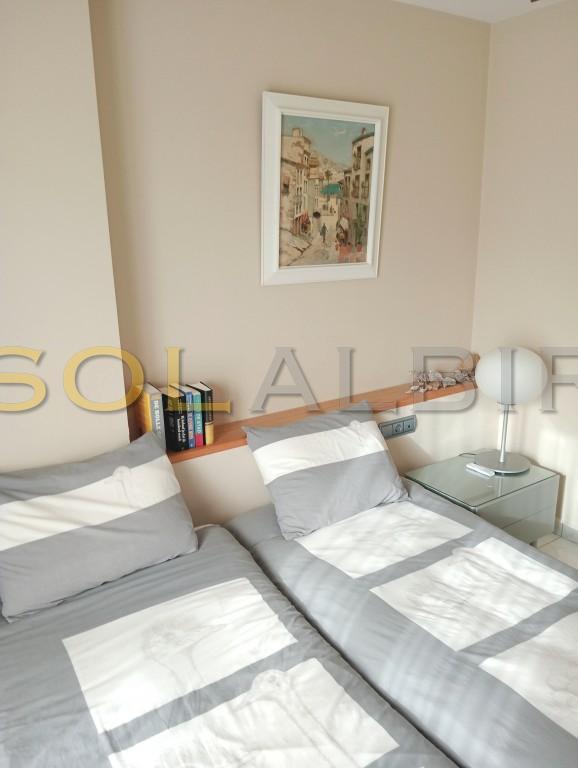 OPEN VIEWS-SOUTH FACING TOP FLOOR CORNER APARTMENT NEAR THE BEACH. The apartment has an open kitchen to the living-room with a dining-area and access to the terrace. There are 2 bedrooms with built-in wardrobes, 2 bathrooms, both with shower, and one of them en-suite. Central community gas heating. Electric AC with heating pump. The price includes a closed garage with a storage room. Communal facilities: Garden with a large swimming pool, parking space for one car. Centrally placed in Albir with short distance to the beach and all amenities.