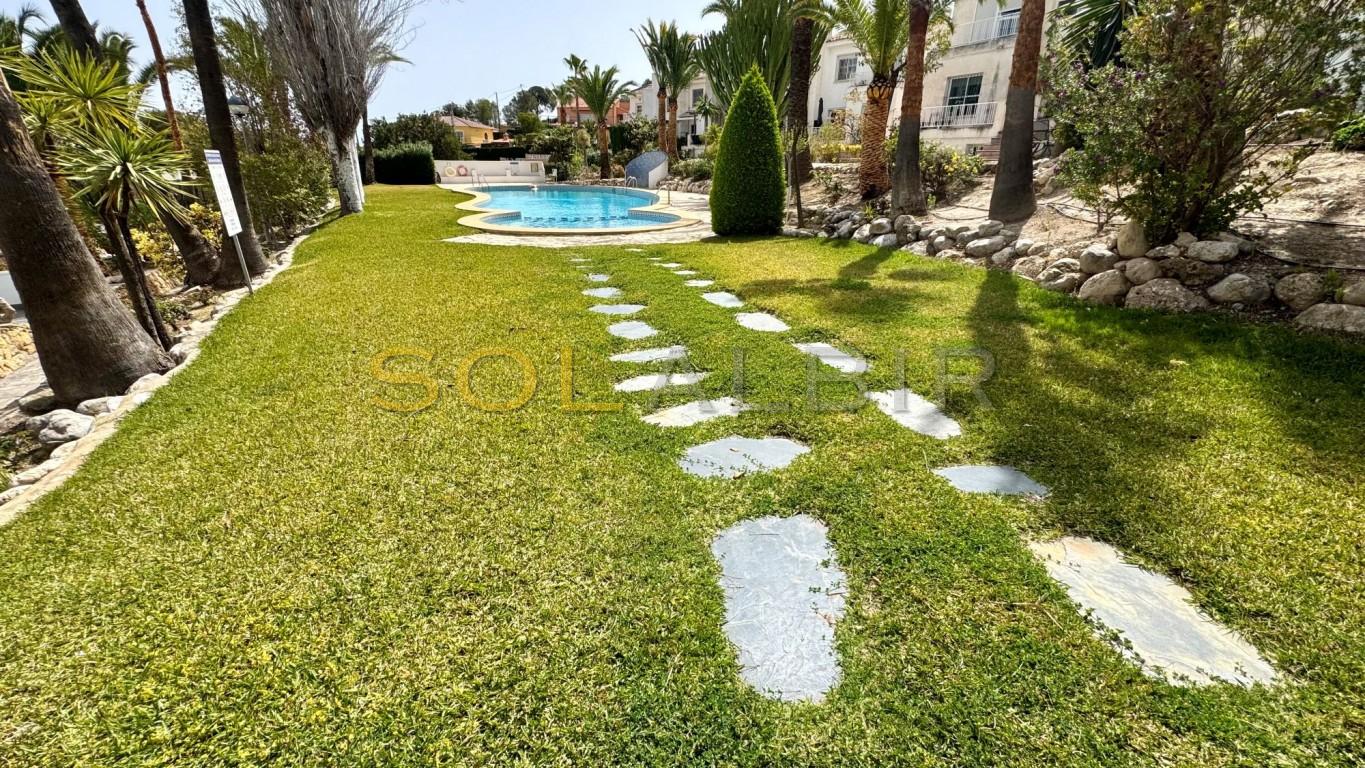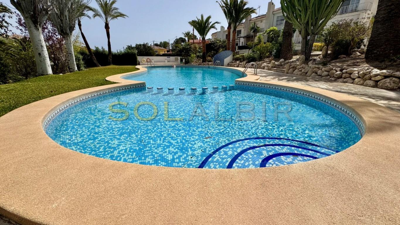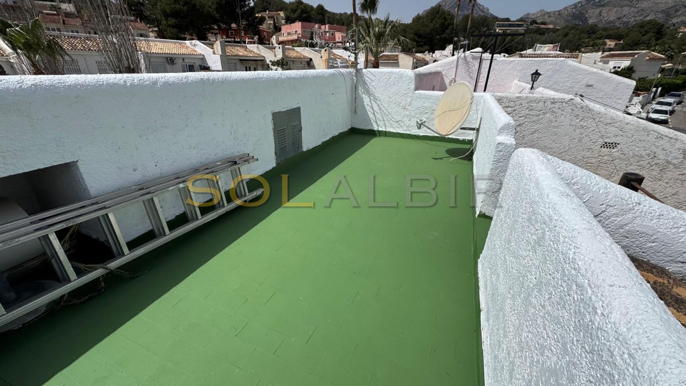 This bright south-facing terraced house is located in a peaceful urbanisation with beautifully maintained communal gardens and a large swimming pool. Although the address belongs to La Nucía, the property is also very conveniently situated close to Alfaz del Pi.